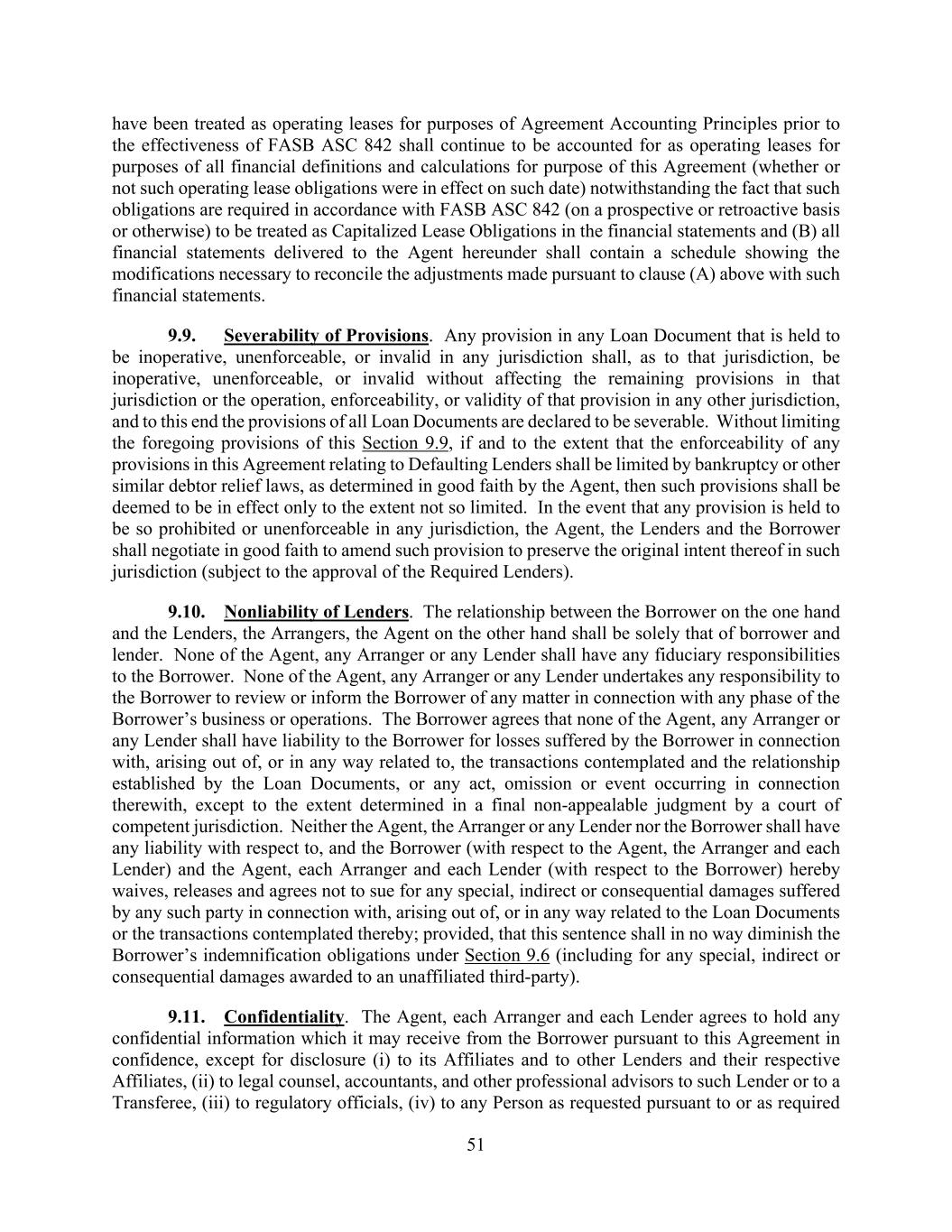 51 have been treated as operating leases for purposes of Agreement Accounting Principles prior to the effectiveness of FASB ASC 842 shall continue to be accounted for as operating leases for purposes of all financial definitions and calculations for purpose of this Agreement (whether or not such operating lease obligations were in effect on such date) notwithstanding the fact that such obligations are required in accordance with FASB ASC 842 (on a prospective or retroactive basis or otherwise) to be treated as Capitalized Lease Obligations in the financial statements and (B) all financial statements delivered to the Agent hereunder shall contain a schedule showing the modifications necessary to reconcile the adjustments made pursuant to clause (A) above with such financial statements. 9.9. Severability of Provisions. Any provision in any Loan Document that is held to be inoperative, unenforceable, or invalid in any jurisdiction shall, as to that jurisdiction, be inoperative, unenforceable, or invalid without affecting the remaining provisions in that jurisdiction or the operation, enforceability, or validity of that provision in any other jurisdiction, and to this end the provisions of all Loan Documents are declared to be severable. Without limiting the foregoing provisions of this Section 9.9, if and to the extent that the enforceability of any provisions in this Agreement relating to Defaulting Lenders shall be limited by bankruptcy or other similar debtor relief laws, as determined in good faith by the Agent, then such provisions shall be deemed to be in effect only to the extent not so limited. In the event that any provision is held to be so prohibited or unenforceable in any jurisdiction, the Agent, the Lenders and the Borrower shall negotiate in good faith to amend such provision to preserve the original intent thereof in such jurisdiction (subject to the approval of the Required Lenders). 9.10. Nonliability of Lenders. The relationship between the Borrower on the one hand and the Lenders, the Arrangers, the Agent on the other hand shall be solely that of borrower and lender. None of the Agent, any Arranger or any Lender shall have any fiduciary responsibilities to the Borrower. None of the Agent, any Arranger or any Lender undertakes any responsibility to the Borrower to review or inform the Borrower of any matter in connection with any phase of the Borrower’s business or operations. The Borrower agrees that none of the Agent, any Arranger or any Lender shall have liability to the Borrower for losses suffered by the Borrower in connection with, arising out of, or in any way related to, the transactions contemplated and the relationship established by the Loan Documents, or any act, omission or event occurring in connection therewith, except to the extent determined in a final non-appealable judgment by a court of competent jurisdiction. Neither the Agent, the Arranger or any Lender nor the Borrower shall have any liability with respect to, and the Borrower (with respect to the Agent, the Arranger and each Lender) and the Agent, each Arranger and each Lender (with respect to the Borrower) hereby waives, releases and agrees not to sue for any special, indirect or consequential damages suffered by any such party in connection with, arising out of, or in any way related to the Loan Documents or the transactions contemplated thereby; provided, that this sentence shall in no way diminish the Borrower’s indemnification obligations under Section 9.6 (including for any special, indirect or consequential damages awarded to an unaffiliated third-party). 9.11. Confidentiality. The Agent, each Arranger and each Lender agrees to hold any confidential information which it may receive from the Borrower pursuant to this Agreement in confidence, except for disclosure (i) to its Affiliates and to other Lenders and their respective Affiliates, (ii) to legal counsel, accountants, and other professional advisors to such Lender or to a Transferee, (iii) to regulatory officials, (iv) to any Person as requested pursuant to or as required