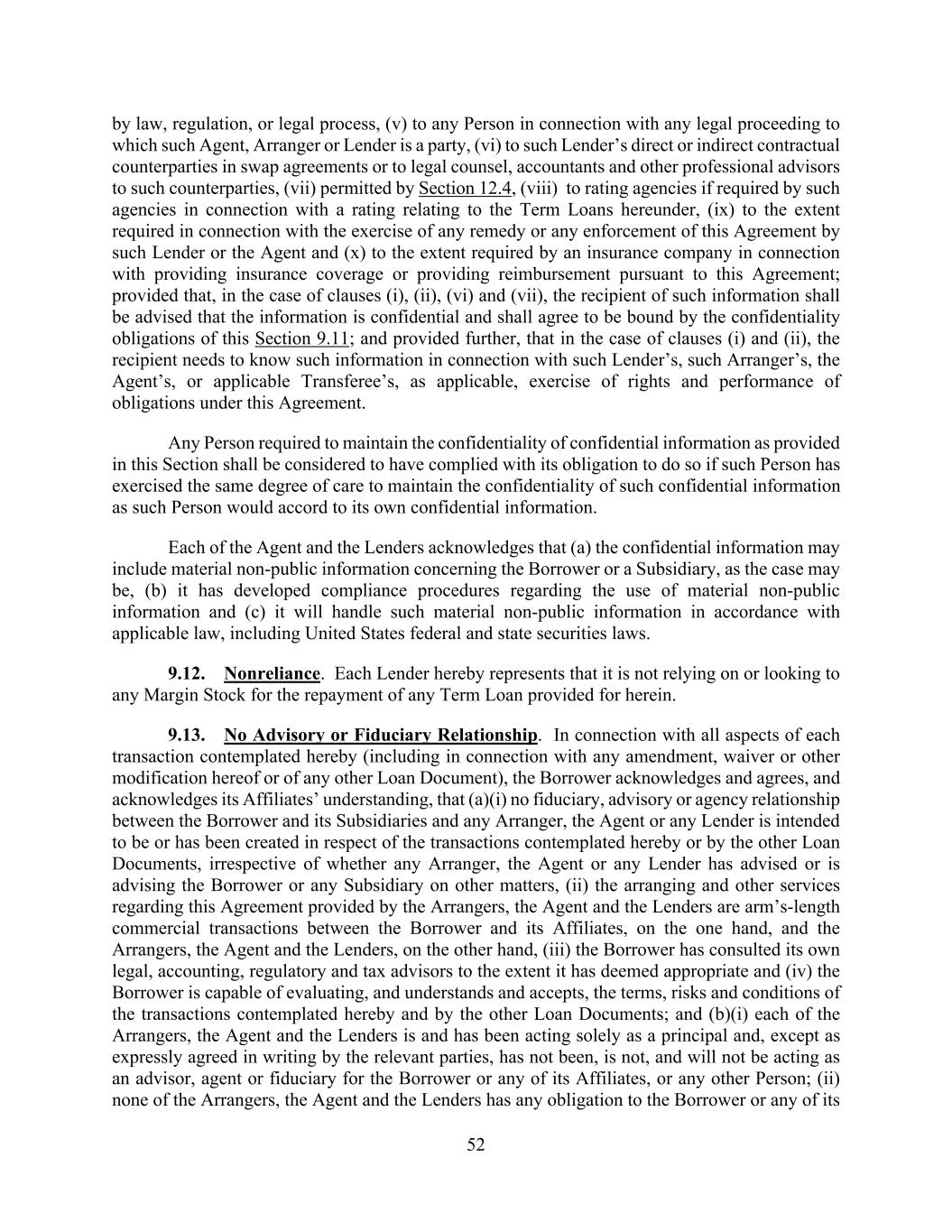 52 by law, regulation, or legal process, (v) to any Person in connection with any legal proceeding to which such Agent, Arranger or Lender is a party, (vi) to such Lender’s direct or indirect contractual counterparties in swap agreements or to legal counsel, accountants and other professional advisors to such counterparties, (vii) permitted by Section 12.4, (viii) to rating agencies if required by such agencies in connection with a rating relating to the Term Loans hereunder, (ix) to the extent required in connection with the exercise of any remedy or any enforcement of this Agreement by such Lender or the Agent and (x) to the extent required by an insurance company in connection with providing insurance coverage or providing reimbursement pursuant to this Agreement; provided that, in the case of clauses (i), (ii), (vi) and (vii), the recipient of such information shall be advised that the information is confidential and shall agree to be bound by the confidentiality obligations of this Section 9.11; and provided further, that in the case of clauses (i) and (ii), the recipient needs to know such information in connection with such Lender’s, such Arranger’s, the Agent’s, or applicable Transferee’s, as applicable, exercise of rights and performance of obligations under this Agreement. Any Person required to maintain the confidentiality of confidential information as provided in this Section shall be considered to have complied with its obligation to do so if such Person has exercised the same degree of care to maintain the confidentiality of such confidential information as such Person would accord to its own confidential information. Each of the Agent and the Lenders acknowledges that (a) the confidential information may include material non-public information concerning the Borrower or a Subsidiary, as the case may be, (b) it has developed compliance procedures regarding the use of material non-public information and (c) it will handle such material non-public information in accordance with applicable law, including United States federal and state securities laws. 9.12. Nonreliance. Each Lender hereby represents that it is not relying on or looking to any Margin Stock for the repayment of any Term Loan provided for herein. 9.13. No Advisory or Fiduciary Relationship. In connection with all aspects of each transaction contemplated hereby (including in connection with any amendment, waiver or other modification hereof or of any other Loan Document), the Borrower acknowledges and agrees, and acknowledges its Affiliates’ understanding, that (a)(i) no fiduciary, advisory or agency relationship between the Borrower and its Subsidiaries and any Arranger, the Agent or any Lender is intended to be or has been created in respect of the transactions contemplated hereby or by the other Loan Documents, irrespective of whether any Arranger, the Agent or any Lender has advised or is advising the Borrower or any Subsidiary on other matters, (ii) the arranging and other services regarding this Agreement provided by the Arrangers, the Agent and the Lenders are arm’s-length commercial transactions between the Borrower and its Affiliates, on the one hand, and the Arrangers, the Agent and the Lenders, on the other hand, (iii) the Borrower has consulted its own legal, accounting, regulatory and tax advisors to the extent it has deemed appropriate and (iv) the Borrower is capable of evaluating, and understands and accepts, the terms, risks and conditions of the transactions contemplated hereby and by the other Loan Documents; and (b)(i) each of the Arrangers, the Agent and the Lenders is and has been acting solely as a principal and, except as expressly agreed in writing by the relevant parties, has not been, is not, and will not be acting as an advisor, agent or fiduciary for the Borrower or any of its Affiliates, or any other Person; (ii) none of the Arrangers, the Agent and the Lenders has any obligation to the Borrower or any of its