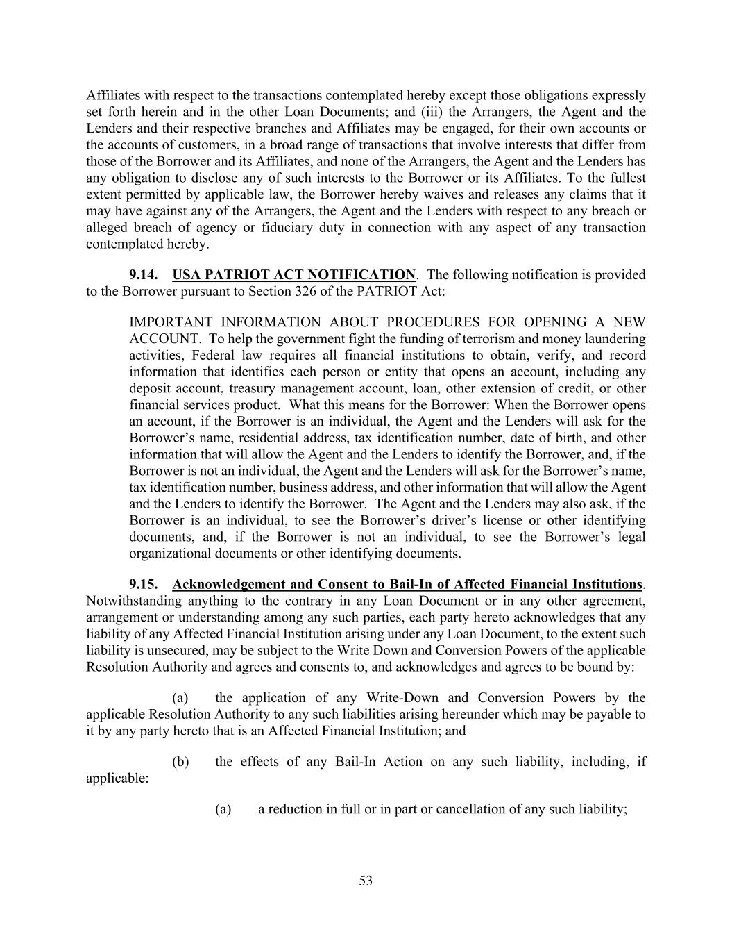 53 Affiliates with respect to the transactions contemplated hereby except those obligations expressly set forth herein and in the other Loan Documents; and (iii) the Arrangers, the Agent and the Lenders and their respective branches and Affiliates may be engaged, for their own accounts or the accounts of customers, in a broad range of transactions that involve interests that differ from those of the Borrower and its Affiliates, and none of the Arrangers, the Agent and the Lenders has any obligation to disclose any of such interests to the Borrower or its Affiliates. To the fullest extent permitted by applicable law, the Borrower hereby waives and releases any claims that it may have against any of the Arrangers, the Agent and the Lenders with respect to any breach or alleged breach of agency or fiduciary duty in connection with any aspect of any transaction contemplated hereby. 9.14. USA PATRIOT ACT NOTIFICATION. The following notification is provided to the Borrower pursuant to Section 326 of the PATRIOT Act: IMPORTANT INFORMATION ABOUT PROCEDURES FOR OPENING A NEW ACCOUNT. To help the government fight the funding of terrorism and money laundering activities, Federal law requires all financial institutions to obtain, verify, and record information that identifies each person or entity that opens an account, including any deposit account, treasury management account, loan, other extension of credit, or other financial services product. What this means for the Borrower: When the Borrower opens an account, if the Borrower is an individual, the Agent and the Lenders will ask for the Borrower’s name, residential address, tax identification number, date of birth, and other information that will allow the Agent and the Lenders to identify the Borrower, and, if the Borrower is not an individual, the Agent and the Lenders will ask for the Borrower’s name, tax identification number, business address, and other information that will allow the Agent and the Lenders to identify the Borrower. The Agent and the Lenders may also ask, if the Borrower is an individual, to see the Borrower’s driver’s license or other identifying documents, and, if the Borrower is not an individual, to see the Borrower’s legal organizational documents or other identifying documents. 9.15. Acknowledgement and Consent to Bail-In of Affected Financial Institutions. Notwithstanding anything to the contrary in any Loan Document or in any other agreement, arrangement or understanding among any such parties, each party hereto acknowledges that any liability of any Affected Financial Institution arising under any Loan Document, to the extent such liability is unsecured, may be subject to the Write Down and Conversion Powers of the applicable Resolution Authority and agrees and consents to, and acknowledges and agrees to be bound by: (a) the application of any Write-Down and Conversion Powers by the applicable Resolution Authority to any such liabilities arising hereunder which may be payable to it by any party hereto that is an Affected Financial Institution; and (b) the effects of any Bail-In Action on any such liability, including, if applicable: (a) a reduction in full or in part or cancellation of any such liability;