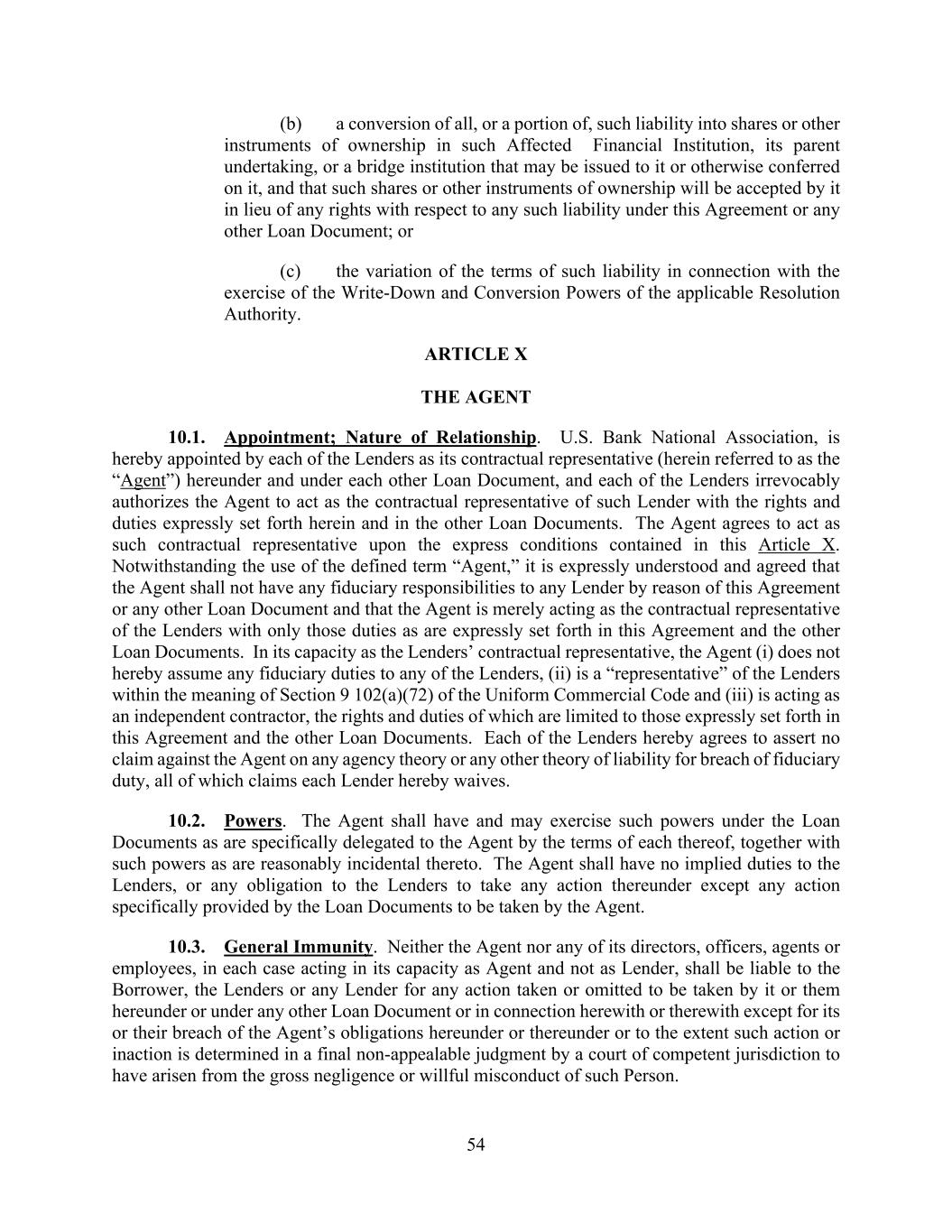 54 (b) a conversion of all, or a portion of, such liability into shares or other instruments of ownership in such Affected Financial Institution, its parent undertaking, or a bridge institution that may be issued to it or otherwise conferred on it, and that such shares or other instruments of ownership will be accepted by it in lieu of any rights with respect to any such liability under this Agreement or any other Loan Document; or (c) the variation of the terms of such liability in connection with the exercise of the Write-Down and Conversion Powers of the applicable Resolution Authority. ARTICLE X THE AGENT 10.1. Appointment; Nature of Relationship. U.S. Bank National Association, is hereby appointed by each of the Lenders as its contractual representative (herein referred to as the “Agent”) hereunder and under each other Loan Document, and each of the Lenders irrevocably authorizes the Agent to act as the contractual representative of such Lender with the rights and duties expressly set forth herein and in the other Loan Documents. The Agent agrees to act as such contractual representative upon the express conditions contained in this Article X. Notwithstanding the use of the defined term “Agent,” it is expressly understood and agreed that the Agent shall not have any fiduciary responsibilities to any Lender by reason of this Agreement or any other Loan Document and that the Agent is merely acting as the contractual representative of the Lenders with only those duties as are expressly set forth in this Agreement and the other Loan Documents. In its capacity as the Lenders’ contractual representative, the Agent (i) does not hereby assume any fiduciary duties to any of the Lenders, (ii) is a “representative” of the Lenders within the meaning of Section 9 102(a)(72) of the Uniform Commercial Code and (iii) is acting as an independent contractor, the rights and duties of which are limited to those expressly set forth in this Agreement and the other Loan Documents. Each of the Lenders hereby agrees to assert no claim against the Agent on any agency theory or any other theory of liability for breach of fiduciary duty, all of which claims each Lender hereby waives. 10.2. Powers. The Agent shall have and may exercise such powers under the Loan Documents as are specifically delegated to the Agent by the terms of each thereof, together with such powers as are reasonably incidental thereto. The Agent shall have no implied duties to the Lenders, or any obligation to the Lenders to take any action thereunder except any action specifically provided by the Loan Documents to be taken by the Agent. 10.3. General Immunity. Neither the Agent nor any of its directors, officers, agents or employees, in each case acting in its capacity as Agent and not as Lender, shall be liable to the Borrower, the Lenders or any Lender for any action taken or omitted to be taken by it or them hereunder or under any other Loan Document or in connection herewith or therewith except for its or their breach of the Agent’s obligations hereunder or thereunder or to the extent such action or inaction is determined in a final non-appealable judgment by a court of competent jurisdiction to have arisen from the gross negligence or willful misconduct of such Person.