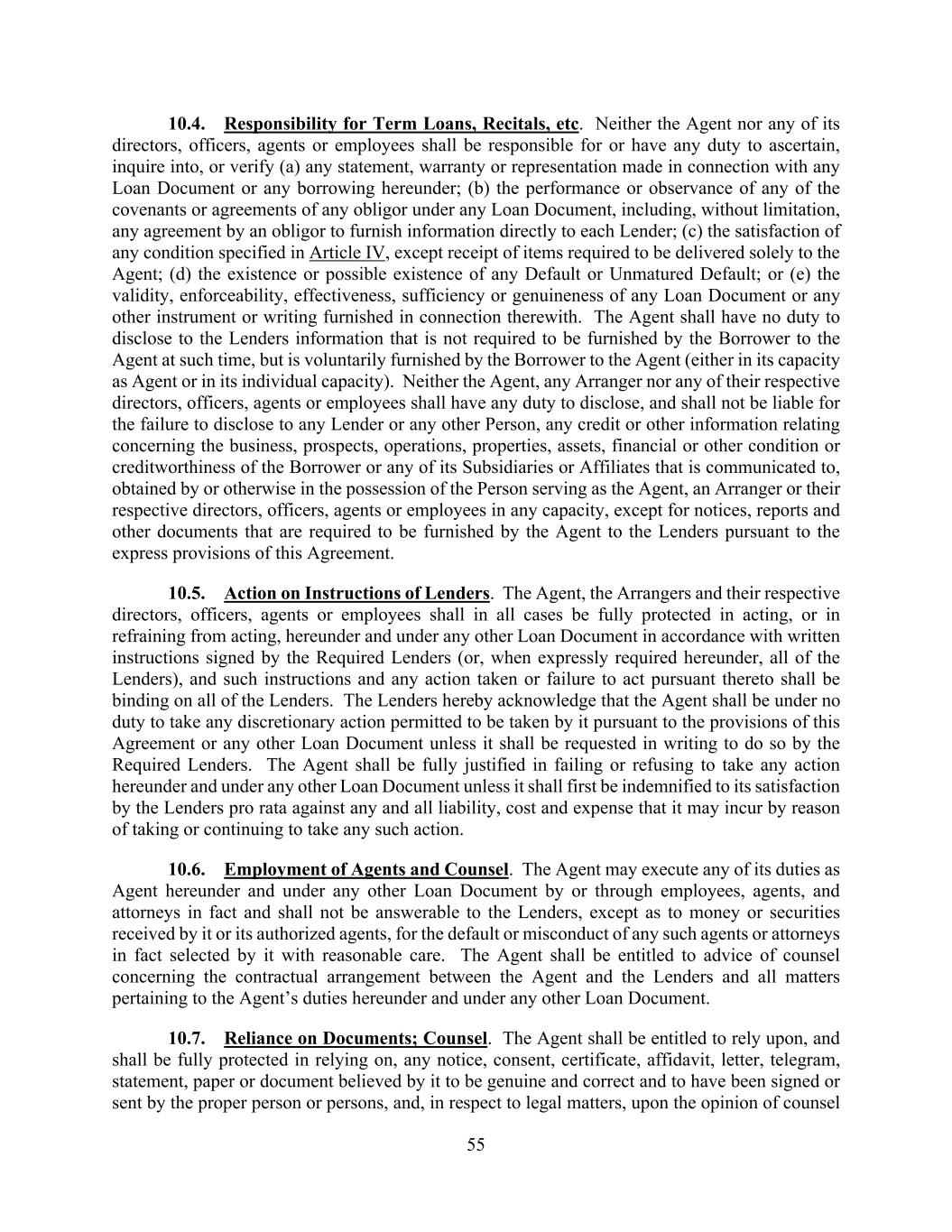 55 10.4. Responsibility for Term Loans, Recitals, etc. Neither the Agent nor any of its directors, officers, agents or employees shall be responsible for or have any duty to ascertain, inquire into, or verify (a) any statement, warranty or representation made in connection with any Loan Document or any borrowing hereunder; (b) the performance or observance of any of the covenants or agreements of any obligor under any Loan Document, including, without limitation, any agreement by an obligor to furnish information directly to each Lender; (c) the satisfaction of any condition specified in Article IV, except receipt of items required to be delivered solely to the Agent; (d) the existence or possible existence of any Default or Unmatured Default; or (e) the validity, enforceability, effectiveness, sufficiency or genuineness of any Loan Document or any other instrument or writing furnished in connection therewith. The Agent shall have no duty to disclose to the Lenders information that is not required to be furnished by the Borrower to the Agent at such time, but is voluntarily furnished by the Borrower to the Agent (either in its capacity as Agent or in its individual capacity). Neither the Agent, any Arranger nor any of their respective directors, officers, agents or employees shall have any duty to disclose, and shall not be liable for the failure to disclose to any Lender or any other Person, any credit or other information relating concerning the business, prospects, operations, properties, assets, financial or other condition or creditworthiness of the Borrower or any of its Subsidiaries or Affiliates that is communicated to, obtained by or otherwise in the possession of the Person serving as the Agent, an Arranger or their respective directors, officers, agents or employees in any capacity, except for notices, reports and other documents that are required to be furnished by the Agent to the Lenders pursuant to the express provisions of this Agreement. 10.5. Action on Instructions of Lenders. The Agent, the Arrangers and their respective directors, officers, agents or employees shall in all cases be fully protected in acting, or in refraining from acting, hereunder and under any other Loan Document in accordance with written instructions signed by the Required Lenders (or, when expressly required hereunder, all of the Lenders), and such instructions and any action taken or failure to act pursuant thereto shall be binding on all of the Lenders. The Lenders hereby acknowledge that the Agent shall be under no duty to take any discretionary action permitted to be taken by it pursuant to the provisions of this Agreement or any other Loan Document unless it shall be requested in writing to do so by the Required Lenders. The Agent shall be fully justified in failing or refusing to take any action hereunder and under any other Loan Document unless it shall first be indemnified to its satisfaction by the Lenders pro rata against any and all liability, cost and expense that it may incur by reason of taking or continuing to take any such action. 10.6. Employment of Agents and Counsel. The Agent may execute any of its duties as Agent hereunder and under any other Loan Document by or through employees, agents, and attorneys in fact and shall not be answerable to the Lenders, except as to money or securities received by it or its authorized agents, for the default or misconduct of any such agents or attorneys in fact selected by it with reasonable care. The Agent shall be entitled to advice of counsel concerning the contractual arrangement between the Agent and the Lenders and all matters pertaining to the Agent’s duties hereunder and under any other Loan Document. 10.7. Reliance on Documents; Counsel. The Agent shall be entitled to rely upon, and shall be fully protected in relying on, any notice, consent, certificate, affidavit, letter, telegram, statement, paper or document believed by it to be genuine and correct and to have been signed or sent by the proper person or persons, and, in respect to legal matters, upon the opinion of counsel