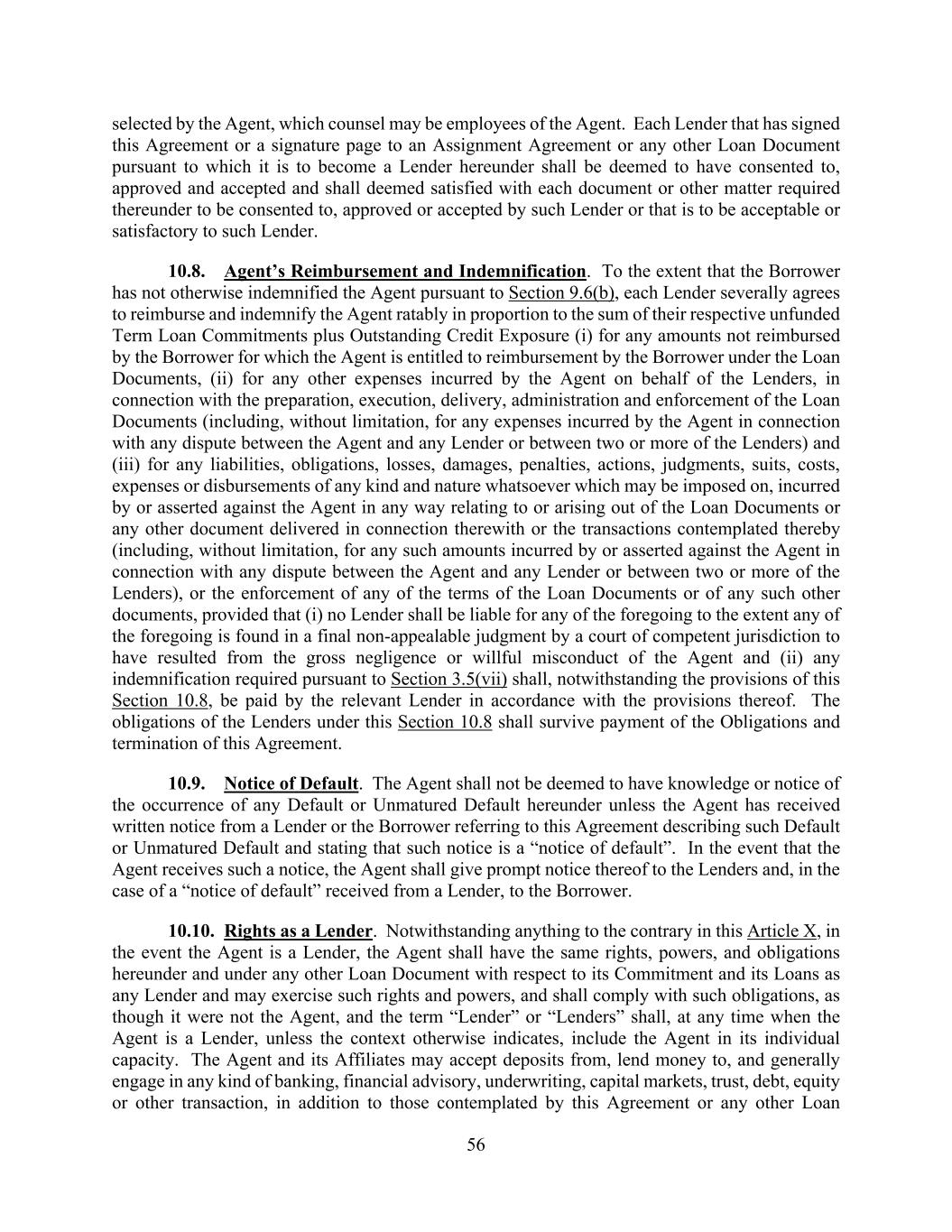 56 selected by the Agent, which counsel may be employees of the Agent. Each Lender that has signed this Agreement or a signature page to an Assignment Agreement or any other Loan Document pursuant to which it is to become a Lender hereunder shall be deemed to have consented to, approved and accepted and shall deemed satisfied with each document or other matter required thereunder to be consented to, approved or accepted by such Lender or that is to be acceptable or satisfactory to such Lender. 10.8. Agent’s Reimbursement and Indemnification. To the extent that the Borrower has not otherwise indemnified the Agent pursuant to Section 9.6(b), each Lender severally agrees to reimburse and indemnify the Agent ratably in proportion to the sum of their respective unfunded Term Loan Commitments plus Outstanding Credit Exposure (i) for any amounts not reimbursed by the Borrower for which the Agent is entitled to reimbursement by the Borrower under the Loan Documents, (ii) for any other expenses incurred by the Agent on behalf of the Lenders, in connection with the preparation, execution, delivery, administration and enforcement of the Loan Documents (including, without limitation, for any expenses incurred by the Agent in connection with any dispute between the Agent and any Lender or between two or more of the Lenders) and (iii) for any liabilities, obligations, losses, damages, penalties, actions, judgments, suits, costs, expenses or disbursements of any kind and nature whatsoever which may be imposed on, incurred by or asserted against the Agent in any way relating to or arising out of the Loan Documents or any other document delivered in connection therewith or the transactions contemplated thereby (including, without limitation, for any such amounts incurred by or asserted against the Agent in connection with any dispute between the Agent and any Lender or between two or more of the Lenders), or the enforcement of any of the terms of the Loan Documents or of any such other documents, provided that (i) no Lender shall be liable for any of the foregoing to the extent any of the foregoing is found in a final non-appealable judgment by a court of competent jurisdiction to have resulted from the gross negligence or willful misconduct of the Agent and (ii) any indemnification required pursuant to Section 3.5(vii) shall, notwithstanding the provisions of this Section 10.8, be paid by the relevant Lender in accordance with the provisions thereof. The obligations of the Lenders under this Section 10.8 shall survive payment of the Obligations and termination of this Agreement. 10.9. Notice of Default. The Agent shall not be deemed to have knowledge or notice of the occurrence of any Default or Unmatured Default hereunder unless the Agent has received written notice from a Lender or the Borrower referring to this Agreement describing such Default or Unmatured Default and stating that such notice is a “notice of default”. In the event that the Agent receives such a notice, the Agent shall give prompt notice thereof to the Lenders and, in the case of a “notice of default” received from a Lender, to the Borrower. 10.10. Rights as a Lender. Notwithstanding anything to the contrary in this Article X, in the event the Agent is a Lender, the Agent shall have the same rights, powers, and obligations hereunder and under any other Loan Document with respect to its Commitment and its Loans as any Lender and may exercise such rights and powers, and shall comply with such obligations, as though it were not the Agent, and the term “Lender” or “Lenders” shall, at any time when the Agent is a Lender, unless the context otherwise indicates, include the Agent in its individual capacity. The Agent and its Affiliates may accept deposits from, lend money to, and generally engage in any kind of banking, financial advisory, underwriting, capital markets, trust, debt, equity or other transaction, in addition to those contemplated by this Agreement or any other Loan