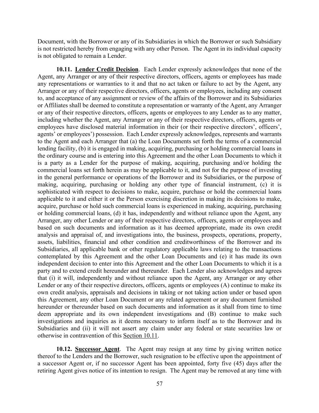 57 Document, with the Borrower or any of its Subsidiaries in which the Borrower or such Subsidiary is not restricted hereby from engaging with any other Person. The Agent in its individual capacity is not obligated to remain a Lender. 10.11. Lender Credit Decision. Each Lender expressly acknowledges that none of the Agent, any Arranger or any of their respective directors, officers, agents or employees has made any representations or warranties to it and that no act taken or failure to act by the Agent, any Arranger or any of their respective directors, officers, agents or employees, including any consent to, and acceptance of any assignment or review of the affairs of the Borrower and its Subsidiaries or Affiliates shall be deemed to constitute a representation or warranty of the Agent, any Arranger or any of their respective directors, officers, agents or employees to any Lender as to any matter, including whether the Agent, any Arranger or any of their respective directors, officers, agents or employees have disclosed material information in their (or their respective directors’, officers’, agents’ or employees’) possession. Each Lender expressly acknowledges, represents and warrants to the Agent and each Arranger that (a) the Loan Documents set forth the terms of a commercial lending facility, (b) it is engaged in making, acquiring, purchasing or holding commercial loans in the ordinary course and is entering into this Agreement and the other Loan Documents to which it is a party as a Lender for the purpose of making, acquiring, purchasing and/or holding the commercial loans set forth herein as may be applicable to it, and not for the purpose of investing in the general performance or operations of the Borrower and its Subsidiaries, or the purpose of making, acquiring, purchasing or holding any other type of financial instrument, (c) it is sophisticated with respect to decisions to make, acquire, purchase or hold the commercial loans applicable to it and either it or the Person exercising discretion in making its decisions to make, acquire, purchase or hold such commercial loans is experienced in making, acquiring, purchasing or holding commercial loans, (d) it has, independently and without reliance upon the Agent, any Arranger, any other Lender or any of their respective directors, officers, agents or employees and based on such documents and information as it has deemed appropriate, made its own credit analysis and appraisal of, and investigations into, the business, prospects, operations, property, assets, liabilities, financial and other condition and creditworthiness of the Borrower and its Subsidiaries, all applicable bank or other regulatory applicable laws relating to the transactions contemplated by this Agreement and the other Loan Documents and (e) it has made its own independent decision to enter into this Agreement and the other Loan Documents to which it is a party and to extend credit hereunder and thereunder. Each Lender also acknowledges and agrees that (i) it will, independently and without reliance upon the Agent, any Arranger or any other Lender or any of their respective directors, officers, agents or employees (A) continue to make its own credit analysis, appraisals and decisions in taking or not taking action under or based upon this Agreement, any other Loan Document or any related agreement or any document furnished hereunder or thereunder based on such documents and information as it shall from time to time deem appropriate and its own independent investigations and (B) continue to make such investigations and inquiries as it deems necessary to inform itself as to the Borrower and its Subsidiaries and (ii) it will not assert any claim under any federal or state securities law or otherwise in contravention of this Section 10.11. 10.12. Successor Agent. The Agent may resign at any time by giving written notice thereof to the Lenders and the Borrower, such resignation to be effective upon the appointment of a successor Agent or, if no successor Agent has been appointed, forty five (45) days after the retiring Agent gives notice of its intention to resign. The Agent may be removed at any time with