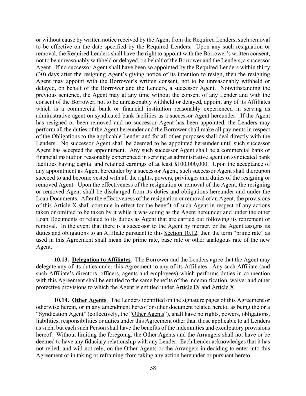 58 or without cause by written notice received by the Agent from the Required Lenders, such removal to be effective on the date specified by the Required Lenders. Upon any such resignation or removal, the Required Lenders shall have the right to appoint with the Borrower’s written consent, not to be unreasonably withheld or delayed, on behalf of the Borrower and the Lenders, a successor Agent. If no successor Agent shall have been so appointed by the Required Lenders within thirty (30) days after the resigning Agent’s giving notice of its intention to resign, then the resigning Agent may appoint with the Borrower’s written consent, not to be unreasonably withheld or delayed, on behalf of the Borrower and the Lenders, a successor Agent. Notwithstanding the previous sentence, the Agent may at any time without the consent of any Lender and with the consent of the Borrower, not to be unreasonably withheld or delayed, appoint any of its Affiliates which is a commercial bank or financial institution reasonably experienced in serving as administrative agent on syndicated bank facilities as a successor Agent hereunder. If the Agent has resigned or been removed and no successor Agent has been appointed, the Lenders may perform all the duties of the Agent hereunder and the Borrower shall make all payments in respect of the Obligations to the applicable Lender and for all other purposes shall deal directly with the Lenders. No successor Agent shall be deemed to be appointed hereunder until such successor Agent has accepted the appointment. Any such successor Agent shall be a commercial bank or financial institution reasonably experienced in serving as administrative agent on syndicated bank facilities having capital and retained earnings of at least $100,000,000. Upon the acceptance of any appointment as Agent hereunder by a successor Agent, such successor Agent shall thereupon succeed to and become vested with all the rights, powers, privileges and duties of the resigning or removed Agent. Upon the effectiveness of the resignation or removal of the Agent, the resigning or removed Agent shall be discharged from its duties and obligations hereunder and under the Loan Documents. After the effectiveness of the resignation or removal of an Agent, the provisions of this Article X shall continue in effect for the benefit of such Agent in respect of any actions taken or omitted to be taken by it while it was acting as the Agent hereunder and under the other Loan Documents or related to its duties as Agent that are carried out following its retirement or removal. In the event that there is a successor to the Agent by merger, or the Agent assigns its duties and obligations to an Affiliate pursuant to this Section 10.12, then the term “prime rate” as used in this Agreement shall mean the prime rate, base rate or other analogous rate of the new Agent. 10.13. Delegation to Affiliates. The Borrower and the Lenders agree that the Agent may delegate any of its duties under this Agreement to any of its Affiliates. Any such Affiliate (and such Affiliate’s directors, officers, agents and employees) which performs duties in connection with this Agreement shall be entitled to the same benefits of the indemnification, waiver and other protective provisions to which the Agent is entitled under Article IX and Article X. 10.14. Other Agents. The Lenders identified on the signature pages of this Agreement or otherwise herein, or in any amendment hereof or other document related hereto, as being the or a “Syndication Agent” (collectively, the “Other Agents”), shall have no rights, powers, obligations, liabilities, responsibilities or duties under this Agreement other than those applicable to all Lenders as such, but each such Person shall have the benefits of the indemnities and exculpatory provisions hereof. Without limiting the foregoing, the Other Agents and the Arrangers shall not have or be deemed to have any fiduciary relationship with any Lender. Each Lender acknowledges that it has not relied, and will not rely, on the Other Agents or the Arrangers in deciding to enter into this Agreement or in taking or refraining from taking any action hereunder or pursuant hereto.