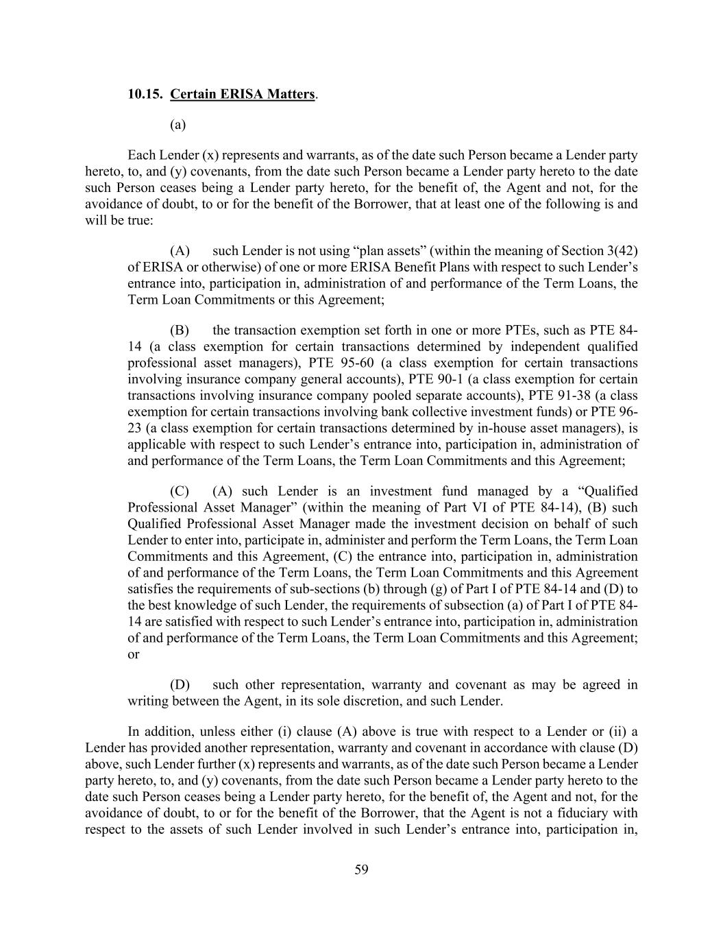 59 10.15. Certain ERISA Matters. (a) Each Lender (x) represents and warrants, as of the date such Person became a Lender party hereto, to, and (y) covenants, from the date such Person became a Lender party hereto to the date such Person ceases being a Lender party hereto, for the benefit of, the Agent and not, for the avoidance of doubt, to or for the benefit of the Borrower, that at least one of the following is and will be true: (A) such Lender is not using “plan assets” (within the meaning of Section 3(42) of ERISA or otherwise) of one or more ERISA Benefit Plans with respect to such Lender’s entrance into, participation in, administration of and performance of the Term Loans, the Term Loan Commitments or this Agreement; (B) the transaction exemption set forth in one or more PTEs, such as PTE 84- 14 (a class exemption for certain transactions determined by independent qualified professional asset managers), PTE 95-60 (a class exemption for certain transactions involving insurance company general accounts), PTE 90-1 (a class exemption for certain transactions involving insurance company pooled separate accounts), PTE 91-38 (a class exemption for certain transactions involving bank collective investment funds) or PTE 96- 23 (a class exemption for certain transactions determined by in-house asset managers), is applicable with respect to such Lender’s entrance into, participation in, administration of and performance of the Term Loans, the Term Loan Commitments and this Agreement; (C) (A) such Lender is an investment fund managed by a “Qualified Professional Asset Manager” (within the meaning of Part VI of PTE 84-14), (B) such Qualified Professional Asset Manager made the investment decision on behalf of such Lender to enter into, participate in, administer and perform the Term Loans, the Term Loan Commitments and this Agreement, (C) the entrance into, participation in, administration of and performance of the Term Loans, the Term Loan Commitments and this Agreement satisfies the requirements of sub-sections (b) through (g) of Part I of PTE 84-14 and (D) to the best knowledge of such Lender, the requirements of subsection (a) of Part I of PTE 84- 14 are satisfied with respect to such Lender’s entrance into, participation in, administration of and performance of the Term Loans, the Term Loan Commitments and this Agreement; or (D) such other representation, warranty and covenant as may be agreed in writing between the Agent, in its sole discretion, and such Lender. In addition, unless either (i) clause (A) above is true with respect to a Lender or (ii) a Lender has provided another representation, warranty and covenant in accordance with clause (D) above, such Lender further (x) represents and warrants, as of the date such Person became a Lender party hereto, to, and (y) covenants, from the date such Person became a Lender party hereto to the date such Person ceases being a Lender party hereto, for the benefit of, the Agent and not, for the avoidance of doubt, to or for the benefit of the Borrower, that the Agent is not a fiduciary with respect to the assets of such Lender involved in such Lender’s entrance into, participation in,