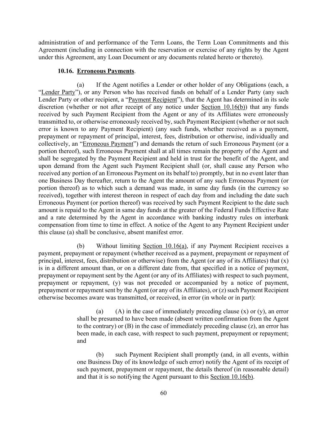 60 administration of and performance of the Term Loans, the Term Loan Commitments and this Agreement (including in connection with the reservation or exercise of any rights by the Agent under this Agreement, any Loan Document or any documents related hereto or thereto). 10.16. Erroneous Payments. (a) If the Agent notifies a Lender or other holder of any Obligations (each, a “Lender Party”), or any Person who has received funds on behalf of a Lender Party (any such Lender Party or other recipient, a “Payment Recipient”), that the Agent has determined in its sole discretion (whether or not after receipt of any notice under Section 10.16(b)) that any funds received by such Payment Recipient from the Agent or any of its Affiliates were erroneously transmitted to, or otherwise erroneously received by, such Payment Recipient (whether or not such error is known to any Payment Recipient) (any such funds, whether received as a payment, prepayment or repayment of principal, interest, fees, distribution or otherwise, individually and collectively, an “Erroneous Payment”) and demands the return of such Erroneous Payment (or a portion thereof), such Erroneous Payment shall at all times remain the property of the Agent and shall be segregated by the Payment Recipient and held in trust for the benefit of the Agent, and upon demand from the Agent such Payment Recipient shall (or, shall cause any Person who received any portion of an Erroneous Payment on its behalf to) promptly, but in no event later than one Business Day thereafter, return to the Agent the amount of any such Erroneous Payment (or portion thereof) as to which such a demand was made, in same day funds (in the currency so received), together with interest thereon in respect of each day from and including the date such Erroneous Payment (or portion thereof) was received by such Payment Recipient to the date such amount is repaid to the Agent in same day funds at the greater of the Federal Funds Effective Rate and a rate determined by the Agent in accordance with banking industry rules on interbank compensation from time to time in effect. A notice of the Agent to any Payment Recipient under this clause (a) shall be conclusive, absent manifest error. (b) Without limiting Section 10.16(a), if any Payment Recipient receives a payment, prepayment or repayment (whether received as a payment, prepayment or repayment of principal, interest, fees, distribution or otherwise) from the Agent (or any of its Affiliates) that (x) is in a different amount than, or on a different date from, that specified in a notice of payment, prepayment or repayment sent by the Agent (or any of its Affiliates) with respect to such payment, prepayment or repayment, (y) was not preceded or accompanied by a notice of payment, prepayment or repayment sent by the Agent (or any of its Affiliates), or (z) such Payment Recipient otherwise becomes aware was transmitted, or received, in error (in whole or in part): (a) (A) in the case of immediately preceding clause (x) or (y), an error shall be presumed to have been made (absent written confirmation from the Agent to the contrary) or (B) in the case of immediately preceding clause (z), an error has been made, in each case, with respect to such payment, prepayment or repayment; and (b) such Payment Recipient shall promptly (and, in all events, within one Business Day of its knowledge of such error) notify the Agent of its receipt of such payment, prepayment or repayment, the details thereof (in reasonable detail) and that it is so notifying the Agent pursuant to this Section 10.16(b).