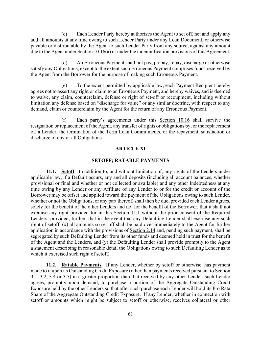 61 (c) Each Lender Party hereby authorizes the Agent to set off, net and apply any and all amounts at any time owing to such Lender Party under any Loan Document, or otherwise payable or distributable by the Agent to such Lender Party from any source, against any amount due to the Agent under Section 10.16(a) or under the indemnification provisions of this Agreement. (d) An Erroneous Payment shall not pay, prepay, repay, discharge or otherwise satisfy any Obligations, except to the extent such Erroneous Payment comprises funds received by the Agent from the Borrower for the purpose of making such Erroneous Payment. (e) To the extent permitted by applicable law, each Payment Recipient hereby agrees not to assert any right or claim to an Erroneous Payment, and hereby waives, and is deemed to waive, any claim, counterclaim, defense or right of set-off or recoupment, including without limitation any defense based on “discharge for value” or any similar doctrine, with respect to any demand, claim or counterclaim by the Agent for the return of any Erroneous Payment. (f) Each party’s agreements under this Section 10.16 shall survive the resignation or replacement of the Agent, any transfer of rights or obligations by, or the replacement of, a Lender, the termination of the Term Loan Commitments, or the repayment, satisfaction or discharge of any or all Obligations. ARTICLE XI SETOFF; RATABLE PAYMENTS 11.1. Setoff. In addition to, and without limitation of, any rights of the Lenders under applicable law, if a Default occurs, any and all deposits (including all account balances, whether provisional or final and whether or not collected or available) and any other Indebtedness at any time owing by any Lender or any Affiliate of any Lender to or for the credit or account of the Borrower may be offset and applied toward the payment of the Obligations owing to such Lender, whether or not the Obligations, or any part thereof, shall then be due, provided each Lender agrees, solely for the benefit of the other Lenders and not for the benefit of the Borrower, that it shall not exercise any right provided for in this Section 11.1 without the prior consent of the Required Lenders; provided, further, that in the event that any Defaulting Lender shall exercise any such right of setoff, (x) all amounts so set off shall be paid over immediately to the Agent for further application in accordance with the provisions of Section 2.14 and, pending such payment, shall be segregated by such Defaulting Lender from its other funds and deemed held in trust for the benefit of the Agent and the Lenders, and (y) the Defaulting Lender shall provide promptly to the Agent a statement describing in reasonable detail the Obligations owing to such Defaulting Lender as to which it exercised such right of setoff. 11.2. Ratable Payments. If any Lender, whether by setoff or otherwise, has payment made to it upon its Outstanding Credit Exposure (other than payments received pursuant to Section 3.1, 3.2, 3.4 or 3.5) in a greater proportion than that received by any other Lender, such Lender agrees, promptly upon demand, to purchase a portion of the Aggregate Outstanding Credit Exposure held by the other Lenders so that after such purchase each Lender will hold its Pro Rata Share of the Aggregate Outstanding Credit Exposure. If any Lender, whether in connection with setoff or amounts which might be subject to setoff or otherwise, receives collateral or other