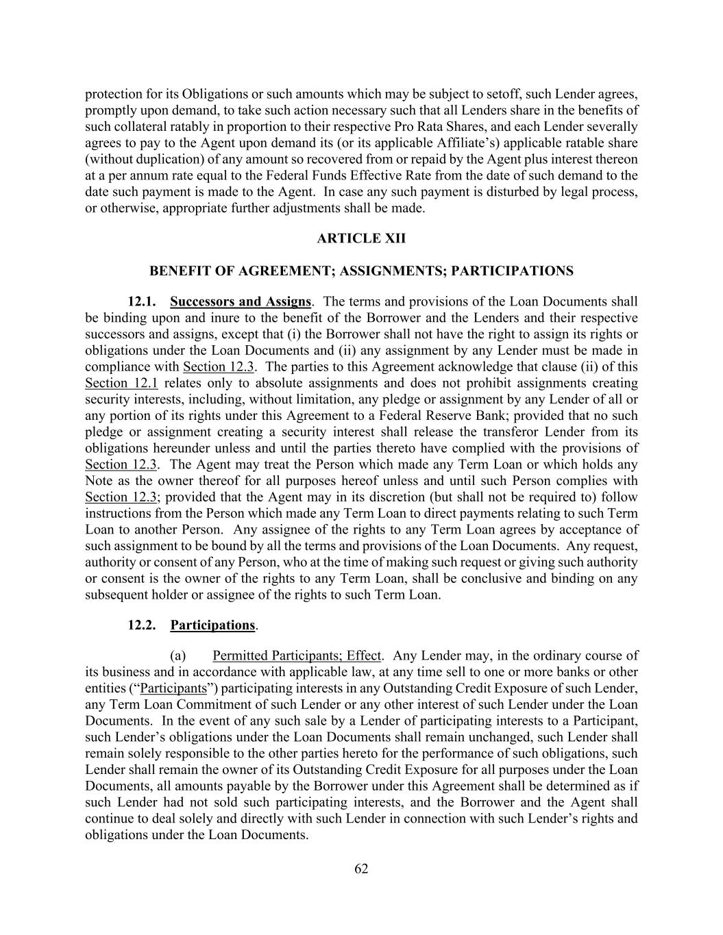 62 protection for its Obligations or such amounts which may be subject to setoff, such Lender agrees, promptly upon demand, to take such action necessary such that all Lenders share in the benefits of such collateral ratably in proportion to their respective Pro Rata Shares, and each Lender severally agrees to pay to the Agent upon demand its (or its applicable Affiliate’s) applicable ratable share (without duplication) of any amount so recovered from or repaid by the Agent plus interest thereon at a per annum rate equal to the Federal Funds Effective Rate from the date of such demand to the date such payment is made to the Agent. In case any such payment is disturbed by legal process, or otherwise, appropriate further adjustments shall be made. ARTICLE XII BENEFIT OF AGREEMENT; ASSIGNMENTS; PARTICIPATIONS 12.1. Successors and Assigns. The terms and provisions of the Loan Documents shall be binding upon and inure to the benefit of the Borrower and the Lenders and their respective successors and assigns, except that (i) the Borrower shall not have the right to assign its rights or obligations under the Loan Documents and (ii) any assignment by any Lender must be made in compliance with Section 12.3. The parties to this Agreement acknowledge that clause (ii) of this Section 12.1 relates only to absolute assignments and does not prohibit assignments creating security interests, including, without limitation, any pledge or assignment by any Lender of all or any portion of its rights under this Agreement to a Federal Reserve Bank; provided that no such pledge or assignment creating a security interest shall release the transferor Lender from its obligations hereunder unless and until the parties thereto have complied with the provisions of Section 12.3. The Agent may treat the Person which made any Term Loan or which holds any Note as the owner thereof for all purposes hereof unless and until such Person complies with Section 12.3; provided that the Agent may in its discretion (but shall not be required to) follow instructions from the Person which made any Term Loan to direct payments relating to such Term Loan to another Person. Any assignee of the rights to any Term Loan agrees by acceptance of such assignment to be bound by all the terms and provisions of the Loan Documents. Any request, authority or consent of any Person, who at the time of making such request or giving such authority or consent is the owner of the rights to any Term Loan, shall be conclusive and binding on any subsequent holder or assignee of the rights to such Term Loan. 12.2. Participations. (a) Permitted Participants; Effect. Any Lender may, in the ordinary course of its business and in accordance with applicable law, at any time sell to one or more banks or other entities (“Participants”) participating interests in any Outstanding Credit Exposure of such Lender, any Term Loan Commitment of such Lender or any other interest of such Lender under the Loan Documents. In the event of any such sale by a Lender of participating interests to a Participant, such Lender’s obligations under the Loan Documents shall remain unchanged, such Lender shall remain solely responsible to the other parties hereto for the performance of such obligations, such Lender shall remain the owner of its Outstanding Credit Exposure for all purposes under the Loan Documents, all amounts payable by the Borrower under this Agreement shall be determined as if such Lender had not sold such participating interests, and the Borrower and the Agent shall continue to deal solely and directly with such Lender in connection with such Lender’s rights and obligations under the Loan Documents.
