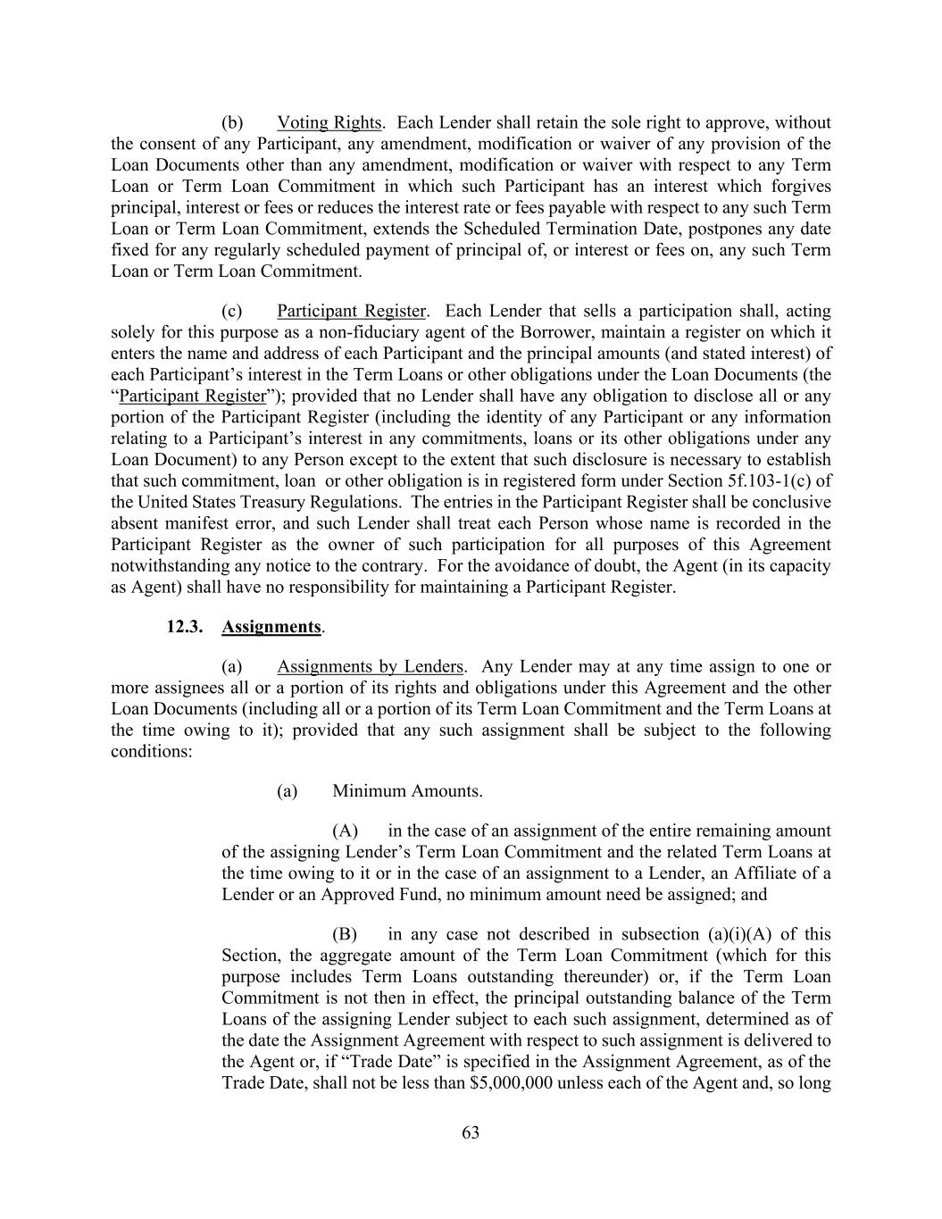 63 (b) Voting Rights. Each Lender shall retain the sole right to approve, without the consent of any Participant, any amendment, modification or waiver of any provision of the Loan Documents other than any amendment, modification or waiver with respect to any Term Loan or Term Loan Commitment in which such Participant has an interest which forgives principal, interest or fees or reduces the interest rate or fees payable with respect to any such Term Loan or Term Loan Commitment, extends the Scheduled Termination Date, postpones any date fixed for any regularly scheduled payment of principal of, or interest or fees on, any such Term Loan or Term Loan Commitment. (c) Participant Register. Each Lender that sells a participation shall, acting solely for this purpose as a non-fiduciary agent of the Borrower, maintain a register on which it enters the name and address of each Participant and the principal amounts (and stated interest) of each Participant’s interest in the Term Loans or other obligations under the Loan Documents (the “Participant Register”); provided that no Lender shall have any obligation to disclose all or any portion of the Participant Register (including the identity of any Participant or any information relating to a Participant’s interest in any commitments, loans or its other obligations under any Loan Document) to any Person except to the extent that such disclosure is necessary to establish that such commitment, loan or other obligation is in registered form under Section 5f.103-1(c) of the United States Treasury Regulations. The entries in the Participant Register shall be conclusive absent manifest error, and such Lender shall treat each Person whose name is recorded in the Participant Register as the owner of such participation for all purposes of this Agreement notwithstanding any notice to the contrary. For the avoidance of doubt, the Agent (in its capacity as Agent) shall have no responsibility for maintaining a Participant Register. 12.3. Assignments. (a) Assignments by Lenders. Any Lender may at any time assign to one or more assignees all or a portion of its rights and obligations under this Agreement and the other Loan Documents (including all or a portion of its Term Loan Commitment and the Term Loans at the time owing to it); provided that any such assignment shall be subject to the following conditions: (a) Minimum Amounts. (A) in the case of an assignment of the entire remaining amount of the assigning Lender’s Term Loan Commitment and the related Term Loans at the time owing to it or in the case of an assignment to a Lender, an Affiliate of a Lender or an Approved Fund, no minimum amount need be assigned; and (B) in any case not described in subsection (a)(i)(A) of this Section, the aggregate amount of the Term Loan Commitment (which for this purpose includes Term Loans outstanding thereunder) or, if the Term Loan Commitment is not then in effect, the principal outstanding balance of the Term Loans of the assigning Lender subject to each such assignment, determined as of the date the Assignment Agreement with respect to such assignment is delivered to the Agent or, if “Trade Date” is specified in the Assignment Agreement, as of the Trade Date, shall not be less than $5,000,000 unless each of the Agent and, so long
