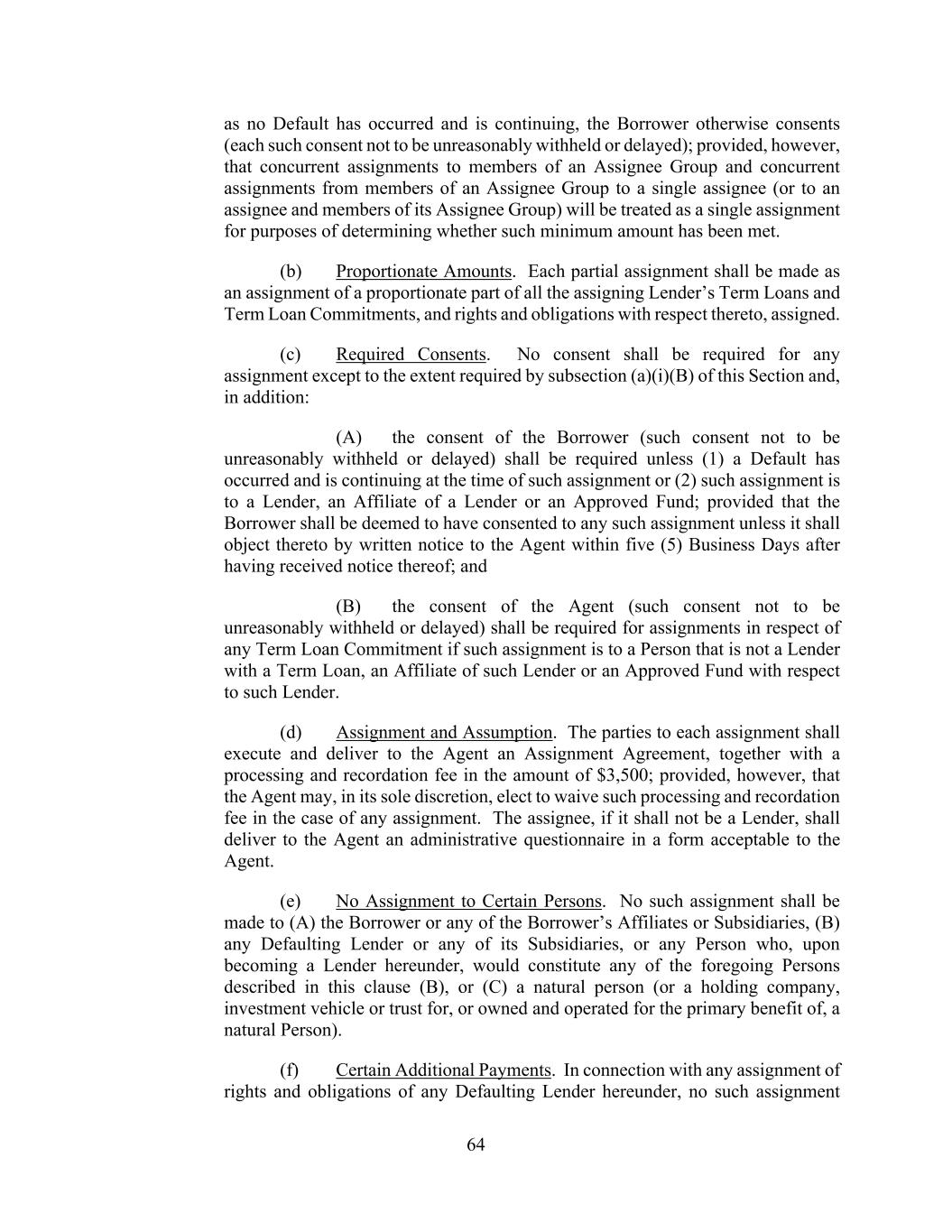 64 as no Default has occurred and is continuing, the Borrower otherwise consents (each such consent not to be unreasonably withheld or delayed); provided, however, that concurrent assignments to members of an Assignee Group and concurrent assignments from members of an Assignee Group to a single assignee (or to an assignee and members of its Assignee Group) will be treated as a single assignment for purposes of determining whether such minimum amount has been met. (b) Proportionate Amounts. Each partial assignment shall be made as an assignment of a proportionate part of all the assigning Lender’s Term Loans and Term Loan Commitments, and rights and obligations with respect thereto, assigned. (c) Required Consents. No consent shall be required for any assignment except to the extent required by subsection (a)(i)(B) of this Section and, in addition: (A) the consent of the Borrower (such consent not to be unreasonably withheld or delayed) shall be required unless (1) a Default has occurred and is continuing at the time of such assignment or (2) such assignment is to a Lender, an Affiliate of a Lender or an Approved Fund; provided that the Borrower shall be deemed to have consented to any such assignment unless it shall object thereto by written notice to the Agent within five (5) Business Days after having received notice thereof; and (B) the consent of the Agent (such consent not to be unreasonably withheld or delayed) shall be required for assignments in respect of any Term Loan Commitment if such assignment is to a Person that is not a Lender with a Term Loan, an Affiliate of such Lender or an Approved Fund with respect to such Lender. (d) Assignment and Assumption. The parties to each assignment shall execute and deliver to the Agent an Assignment Agreement, together with a processing and recordation fee in the amount of $3,500; provided, however, that the Agent may, in its sole discretion, elect to waive such processing and recordation fee in the case of any assignment. The assignee, if it shall not be a Lender, shall deliver to the Agent an administrative questionnaire in a form acceptable to the Agent. (e) No Assignment to Certain Persons. No such assignment shall be made to (A) the Borrower or any of the Borrower’s Affiliates or Subsidiaries, (B) any Defaulting Lender or any of its Subsidiaries, or any Person who, upon becoming a Lender hereunder, would constitute any of the foregoing Persons described in this clause (B), or (C) a natural person (or a holding company, investment vehicle or trust for, or owned and operated for the primary benefit of, a natural Person). (f) Certain Additional Payments. In connection with any assignment of rights and obligations of any Defaulting Lender hereunder, no such assignment