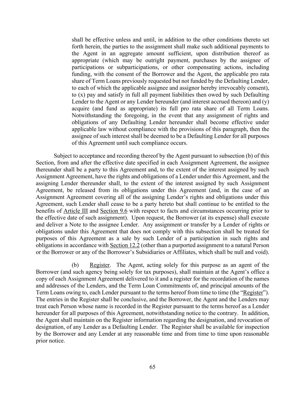 65 shall be effective unless and until, in addition to the other conditions thereto set forth herein, the parties to the assignment shall make such additional payments to the Agent in an aggregate amount sufficient, upon distribution thereof as appropriate (which may be outright payment, purchases by the assignee of participations or subparticipations, or other compensating actions, including funding, with the consent of the Borrower and the Agent, the applicable pro rata share of Term Loans previously requested but not funded by the Defaulting Lender, to each of which the applicable assignee and assignor hereby irrevocably consent), to (x) pay and satisfy in full all payment liabilities then owed by such Defaulting Lender to the Agent or any Lender hereunder (and interest accrued thereon) and (y) acquire (and fund as appropriate) its full pro rata share of all Term Loans. Notwithstanding the foregoing, in the event that any assignment of rights and obligations of any Defaulting Lender hereunder shall become effective under applicable law without compliance with the provisions of this paragraph, then the assignee of such interest shall be deemed to be a Defaulting Lender for all purposes of this Agreement until such compliance occurs. Subject to acceptance and recording thereof by the Agent pursuant to subsection (b) of this Section, from and after the effective date specified in each Assignment Agreement, the assignee thereunder shall be a party to this Agreement and, to the extent of the interest assigned by such Assignment Agreement, have the rights and obligations of a Lender under this Agreement, and the assigning Lender thereunder shall, to the extent of the interest assigned by such Assignment Agreement, be released from its obligations under this Agreement (and, in the case of an Assignment Agreement covering all of the assigning Lender’s rights and obligations under this Agreement, such Lender shall cease to be a party hereto but shall continue to be entitled to the benefits of Article III and Section 9.6 with respect to facts and circumstances occurring prior to the effective date of such assignment). Upon request, the Borrower (at its expense) shall execute and deliver a Note to the assignee Lender. Any assignment or transfer by a Lender of rights or obligations under this Agreement that does not comply with this subsection shall be treated for purposes of this Agreement as a sale by such Lender of a participation in such rights and obligations in accordance with Section 12.2 (other than a purported assignment to a natural Person or the Borrower or any of the Borrower’s Subsidiaries or Affiliates, which shall be null and void). (b) Register. The Agent, acting solely for this purpose as an agent of the Borrower (and such agency being solely for tax purposes), shall maintain at the Agent’s office a copy of each Assignment Agreement delivered to it and a register for the recordation of the names and addresses of the Lenders, and the Term Loan Commitments of, and principal amounts of the Term Loans owing to, each Lender pursuant to the terms hereof from time to time (the “Register”). The entries in the Register shall be conclusive, and the Borrower, the Agent and the Lenders may treat each Person whose name is recorded in the Register pursuant to the terms hereof as a Lender hereunder for all purposes of this Agreement, notwithstanding notice to the contrary. In addition, the Agent shall maintain on the Register information regarding the designation, and revocation of designation, of any Lender as a Defaulting Lender. The Register shall be available for inspection by the Borrower and any Lender at any reasonable time and from time to time upon reasonable prior notice.