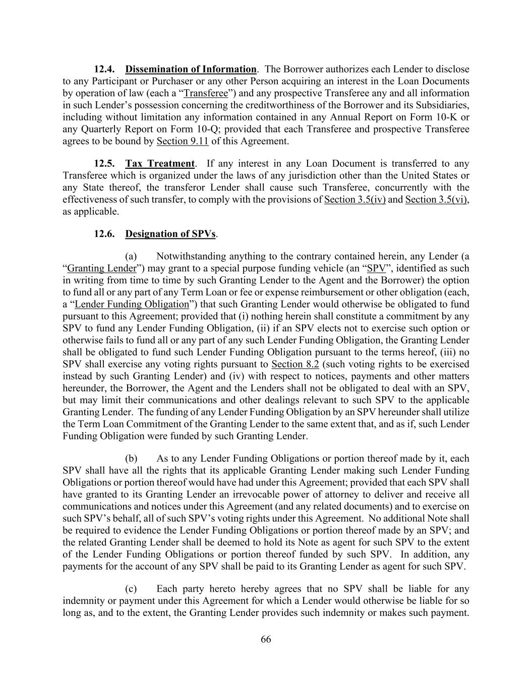 66 12.4. Dissemination of Information. The Borrower authorizes each Lender to disclose to any Participant or Purchaser or any other Person acquiring an interest in the Loan Documents by operation of law (each a “Transferee”) and any prospective Transferee any and all information in such Lender’s possession concerning the creditworthiness of the Borrower and its Subsidiaries, including without limitation any information contained in any Annual Report on Form 10-K or any Quarterly Report on Form 10-Q; provided that each Transferee and prospective Transferee agrees to be bound by Section 9.11 of this Agreement. 12.5. Tax Treatment. If any interest in any Loan Document is transferred to any Transferee which is organized under the laws of any jurisdiction other than the United States or any State thereof, the transferor Lender shall cause such Transferee, concurrently with the effectiveness of such transfer, to comply with the provisions of Section 3.5(iv) and Section 3.5(vi), as applicable. 12.6. Designation of SPVs. (a) Notwithstanding anything to the contrary contained herein, any Lender (a “Granting Lender”) may grant to a special purpose funding vehicle (an “SPV”, identified as such in writing from time to time by such Granting Lender to the Agent and the Borrower) the option to fund all or any part of any Term Loan or fee or expense reimbursement or other obligation (each, a “Lender Funding Obligation”) that such Granting Lender would otherwise be obligated to fund pursuant to this Agreement; provided that (i) nothing herein shall constitute a commitment by any SPV to fund any Lender Funding Obligation, (ii) if an SPV elects not to exercise such option or otherwise fails to fund all or any part of any such Lender Funding Obligation, the Granting Lender shall be obligated to fund such Lender Funding Obligation pursuant to the terms hereof, (iii) no SPV shall exercise any voting rights pursuant to Section 8.2 (such voting rights to be exercised instead by such Granting Lender) and (iv) with respect to notices, payments and other matters hereunder, the Borrower, the Agent and the Lenders shall not be obligated to deal with an SPV, but may limit their communications and other dealings relevant to such SPV to the applicable Granting Lender. The funding of any Lender Funding Obligation by an SPV hereunder shall utilize the Term Loan Commitment of the Granting Lender to the same extent that, and as if, such Lender Funding Obligation were funded by such Granting Lender. (b) As to any Lender Funding Obligations or portion thereof made by it, each SPV shall have all the rights that its applicable Granting Lender making such Lender Funding Obligations or portion thereof would have had under this Agreement; provided that each SPV shall have granted to its Granting Lender an irrevocable power of attorney to deliver and receive all communications and notices under this Agreement (and any related documents) and to exercise on such SPV’s behalf, all of such SPV’s voting rights under this Agreement. No additional Note shall be required to evidence the Lender Funding Obligations or portion thereof made by an SPV; and the related Granting Lender shall be deemed to hold its Note as agent for such SPV to the extent of the Lender Funding Obligations or portion thereof funded by such SPV. In addition, any payments for the account of any SPV shall be paid to its Granting Lender as agent for such SPV. (c) Each party hereto hereby agrees that no SPV shall be liable for any indemnity or payment under this Agreement for which a Lender would otherwise be liable for so long as, and to the extent, the Granting Lender provides such indemnity or makes such payment.