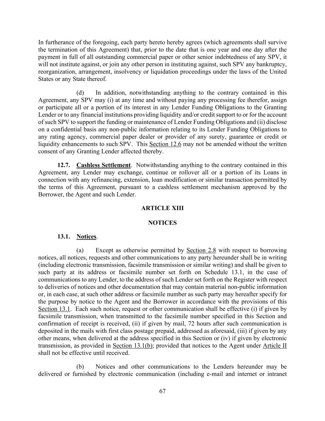 67 In furtherance of the foregoing, each party hereto hereby agrees (which agreements shall survive the termination of this Agreement) that, prior to the date that is one year and one day after the payment in full of all outstanding commercial paper or other senior indebtedness of any SPV, it will not institute against, or join any other person in instituting against, such SPV any bankruptcy, reorganization, arrangement, insolvency or liquidation proceedings under the laws of the United States or any State thereof. (d) In addition, notwithstanding anything to the contrary contained in this Agreement, any SPV may (i) at any time and without paying any processing fee therefor, assign or participate all or a portion of its interest in any Lender Funding Obligations to the Granting Lender or to any financial institutions providing liquidity and/or credit support to or for the account of such SPV to support the funding or maintenance of Lender Funding Obligations and (ii) disclose on a confidential basis any non-public information relating to its Lender Funding Obligations to any rating agency, commercial paper dealer or provider of any surety, guarantee or credit or liquidity enhancements to such SPV. This Section 12.6 may not be amended without the written consent of any Granting Lender affected thereby. 12.7. Cashless Settlement. Notwithstanding anything to the contrary contained in this Agreement, any Lender may exchange, continue or rollover all or a portion of its Loans in connection with any refinancing, extension, loan modification or similar transaction permitted by the terms of this Agreement, pursuant to a cashless settlement mechanism approved by the Borrower, the Agent and such Lender. ARTICLE XIII NOTICES 13.1. Notices. (a) Except as otherwise permitted by Section 2.8 with respect to borrowing notices, all notices, requests and other communications to any party hereunder shall be in writing (including electronic transmission, facsimile transmission or similar writing) and shall be given to such party at its address or facsimile number set forth on Schedule 13.1, in the case of communications to any Lender, to the address of such Lender set forth on the Register with respect to deliveries of notices and other documentation that may contain material non-public information or, in each case, at such other address or facsimile number as such party may hereafter specify for the purpose by notice to the Agent and the Borrower in accordance with the provisions of this Section 13.1. Each such notice, request or other communication shall be effective (i) if given by facsimile transmission, when transmitted to the facsimile number specified in this Section and confirmation of receipt is received, (ii) if given by mail, 72 hours after such communication is deposited in the mails with first class postage prepaid, addressed as aforesaid, (iii) if given by any other means, when delivered at the address specified in this Section or (iv) if given by electronic transmission, as provided in Section 13.1(b); provided that notices to the Agent under Article II shall not be effective until received. (b) Notices and other communications to the Lenders hereunder may be delivered or furnished by electronic communication (including e-mail and internet or intranet