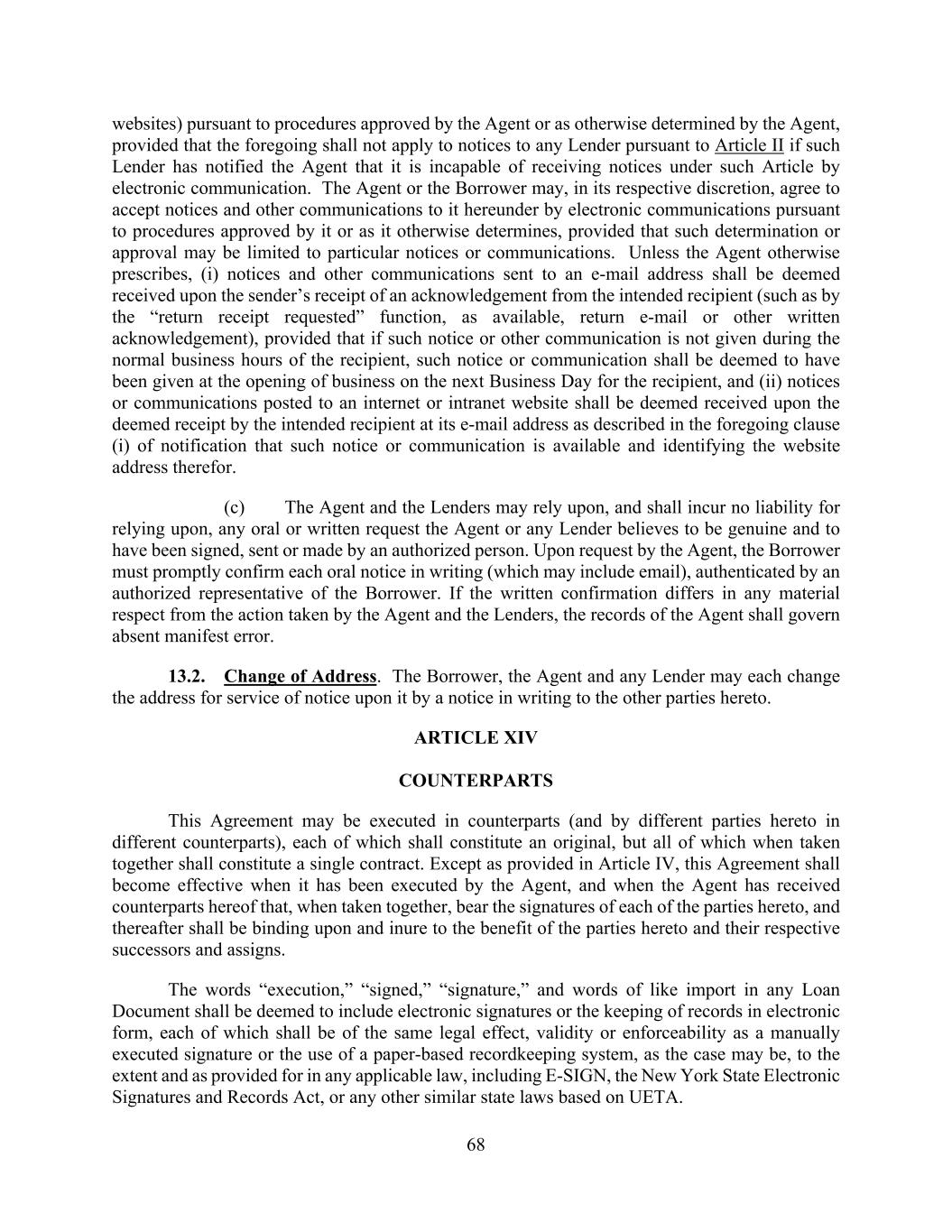 68 websites) pursuant to procedures approved by the Agent or as otherwise determined by the Agent, provided that the foregoing shall not apply to notices to any Lender pursuant to Article II if such Lender has notified the Agent that it is incapable of receiving notices under such Article by electronic communication. The Agent or the Borrower may, in its respective discretion, agree to accept notices and other communications to it hereunder by electronic communications pursuant to procedures approved by it or as it otherwise determines, provided that such determination or approval may be limited to particular notices or communications. Unless the Agent otherwise prescribes, (i) notices and other communications sent to an e-mail address shall be deemed received upon the sender’s receipt of an acknowledgement from the intended recipient (such as by the “return receipt requested” function, as available, return e-mail or other written acknowledgement), provided that if such notice or other communication is not given during the normal business hours of the recipient, such notice or communication shall be deemed to have been given at the opening of business on the next Business Day for the recipient, and (ii) notices or communications posted to an internet or intranet website shall be deemed received upon the deemed receipt by the intended recipient at its e-mail address as described in the foregoing clause (i) of notification that such notice or communication is available and identifying the website address therefor. (c) The Agent and the Lenders may rely upon, and shall incur no liability for relying upon, any oral or written request the Agent or any Lender believes to be genuine and to have been signed, sent or made by an authorized person. Upon request by the Agent, the Borrower must promptly confirm each oral notice in writing (which may include email), authenticated by an authorized representative of the Borrower. If the written confirmation differs in any material respect from the action taken by the Agent and the Lenders, the records of the Agent shall govern absent manifest error. 13.2. Change of Address. The Borrower, the Agent and any Lender may each change the address for service of notice upon it by a notice in writing to the other parties hereto. ARTICLE XIV COUNTERPARTS This Agreement may be executed in counterparts (and by different parties hereto in different counterparts), each of which shall constitute an original, but all of which when taken together shall constitute a single contract. Except as provided in Article IV, this Agreement shall become effective when it has been executed by the Agent, and when the Agent has received counterparts hereof that, when taken together, bear the signatures of each of the parties hereto, and thereafter shall be binding upon and inure to the benefit of the parties hereto and their respective successors and assigns. The words “execution,” “signed,” “signature,” and words of like import in any Loan Document shall be deemed to include electronic signatures or the keeping of records in electronic form, each of which shall be of the same legal effect, validity or enforceability as a manually executed signature or the use of a paper-based recordkeeping system, as the case may be, to the extent and as provided for in any applicable law, including E-SIGN, the New York State Electronic Signatures and Records Act, or any other similar state laws based on UETA.