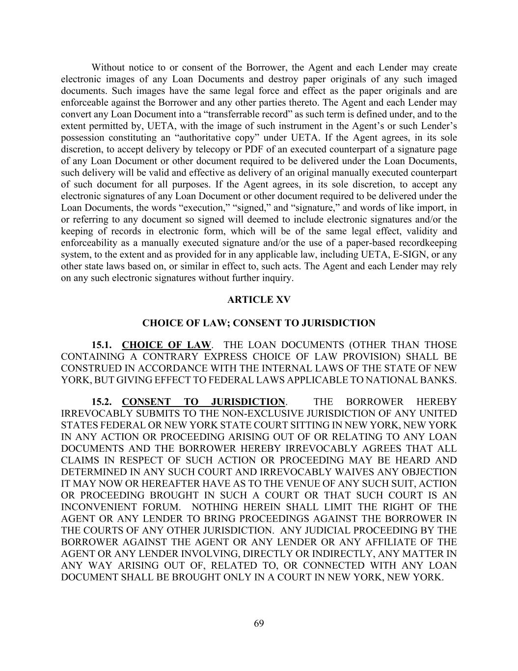 69 Without notice to or consent of the Borrower, the Agent and each Lender may create electronic images of any Loan Documents and destroy paper originals of any such imaged documents. Such images have the same legal force and effect as the paper originals and are enforceable against the Borrower and any other parties thereto. The Agent and each Lender may convert any Loan Document into a “transferrable record” as such term is defined under, and to the extent permitted by, UETA, with the image of such instrument in the Agent’s or such Lender’s possession constituting an “authoritative copy” under UETA. If the Agent agrees, in its sole discretion, to accept delivery by telecopy or PDF of an executed counterpart of a signature page of any Loan Document or other document required to be delivered under the Loan Documents, such delivery will be valid and effective as delivery of an original manually executed counterpart of such document for all purposes. If the Agent agrees, in its sole discretion, to accept any electronic signatures of any Loan Document or other document required to be delivered under the Loan Documents, the words “execution,” “signed,” and “signature,” and words of like import, in or referring to any document so signed will deemed to include electronic signatures and/or the keeping of records in electronic form, which will be of the same legal effect, validity and enforceability as a manually executed signature and/or the use of a paper-based recordkeeping system, to the extent and as provided for in any applicable law, including UETA, E-SIGN, or any other state laws based on, or similar in effect to, such acts. The Agent and each Lender may rely on any such electronic signatures without further inquiry. ARTICLE XV CHOICE OF LAW; CONSENT TO JURISDICTION 15.1. CHOICE OF LAW. THE LOAN DOCUMENTS (OTHER THAN THOSE CONTAINING A CONTRARY EXPRESS CHOICE OF LAW PROVISION) SHALL BE CONSTRUED IN ACCORDANCE WITH THE INTERNAL LAWS OF THE STATE OF NEW YORK, BUT GIVING EFFECT TO FEDERAL LAWS APPLICABLE TO NATIONAL BANKS. 15.2. CONSENT TO JURISDICTION. THE BORROWER HEREBY IRREVOCABLY SUBMITS TO THE NON-EXCLUSIVE JURISDICTION OF ANY UNITED STATES FEDERAL OR NEW YORK STATE COURT SITTING IN NEW YORK, NEW YORK IN ANY ACTION OR PROCEEDING ARISING OUT OF OR RELATING TO ANY LOAN DOCUMENTS AND THE BORROWER HEREBY IRREVOCABLY AGREES THAT ALL CLAIMS IN RESPECT OF SUCH ACTION OR PROCEEDING MAY BE HEARD AND DETERMINED IN ANY SUCH COURT AND IRREVOCABLY WAIVES ANY OBJECTION IT MAY NOW OR HEREAFTER HAVE AS TO THE VENUE OF ANY SUCH SUIT, ACTION OR PROCEEDING BROUGHT IN SUCH A COURT OR THAT SUCH COURT IS AN INCONVENIENT FORUM. NOTHING HEREIN SHALL LIMIT THE RIGHT OF THE AGENT OR ANY LENDER TO BRING PROCEEDINGS AGAINST THE BORROWER IN THE COURTS OF ANY OTHER JURISDICTION. ANY JUDICIAL PROCEEDING BY THE BORROWER AGAINST THE AGENT OR ANY LENDER OR ANY AFFILIATE OF THE AGENT OR ANY LENDER INVOLVING, DIRECTLY OR INDIRECTLY, ANY MATTER IN ANY WAY ARISING OUT OF, RELATED TO, OR CONNECTED WITH ANY LOAN DOCUMENT SHALL BE BROUGHT ONLY IN A COURT IN NEW YORK, NEW YORK.