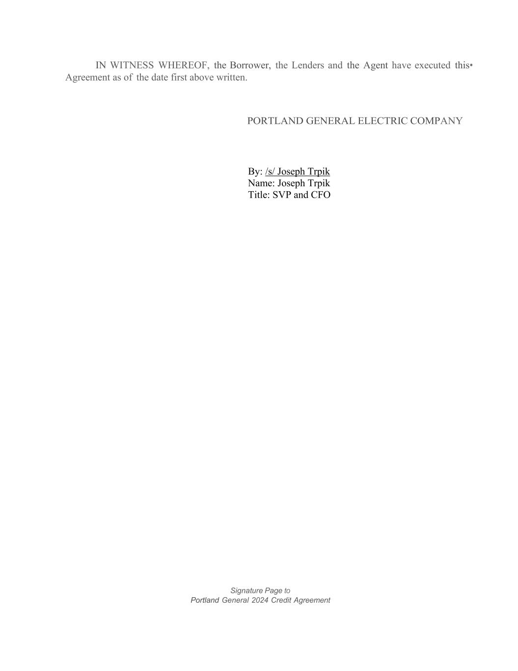 IN WITNESS WHEREOF, the Borrower, the Lenders and the Agent have executed this• Agreement as of the date first above written. PORTLAND GENERAL ELECTRIC COMPANY By: /s/ Joseph Trpik Name: Joseph Trpik Title: SVP and CFO Signature Page to Portland General 2024 Credit Agreement