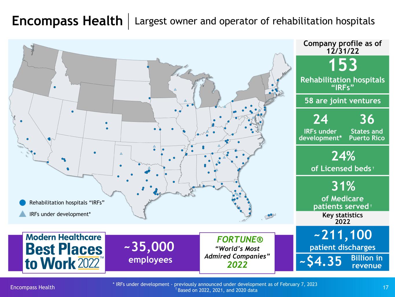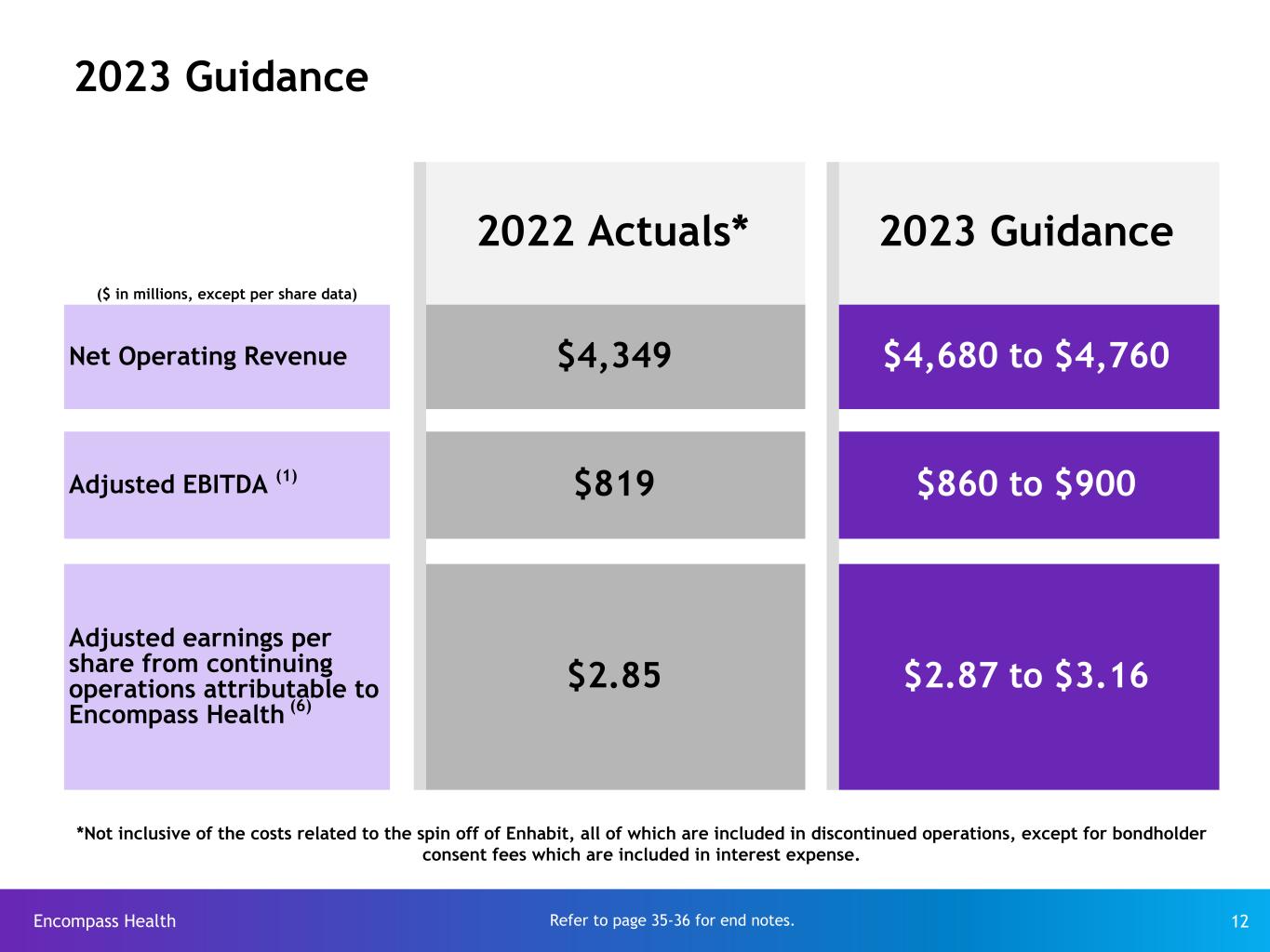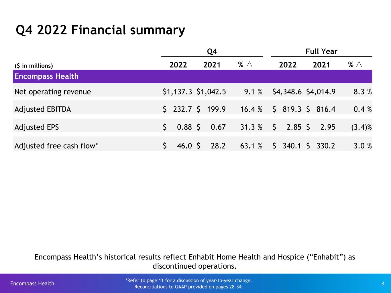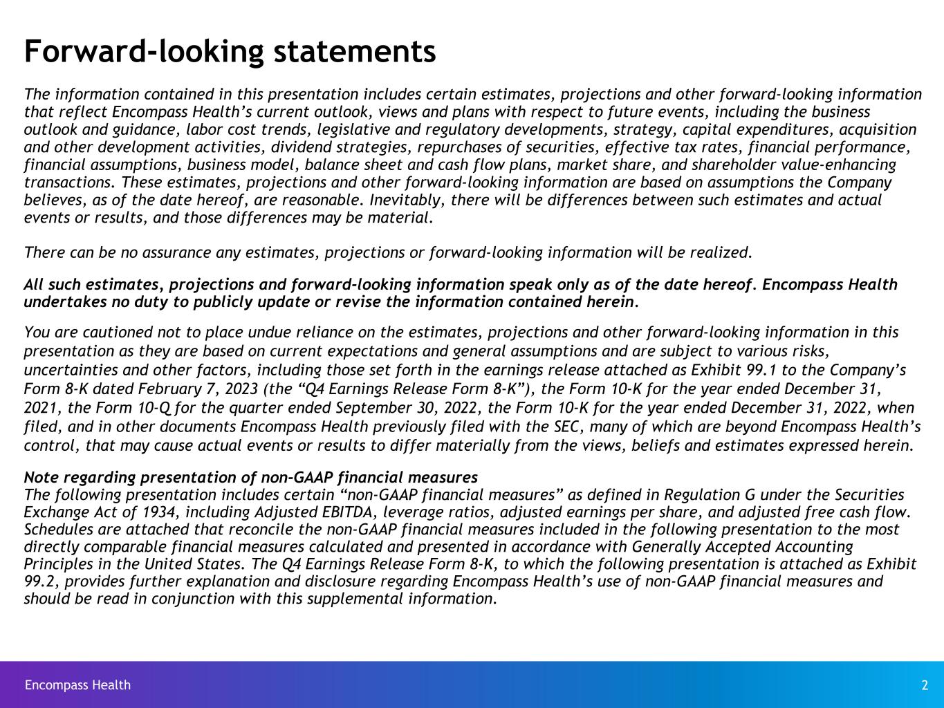 Encompass Health 2 The information contained in this presentation includes certain estimates, projections and other forward-looking information that reflect Encompass Health’s current outlook, views and plans with respect to future events, including the business outlook and guidance, labor cost trends, legislative and regulatory developments, strategy, capital expenditures, acquisition and other development activities, dividend strategies, repurchases of securities, effective tax rates, financial performance, financial assumptions, business model, balance sheet and cash flow plans, market share, and shareholder value-enhancing transactions. These estimates, projections and other forward-looking information are based on assumptions the Company believes, as of the date hereof, are reasonable. Inevitably, there will be differences between such estimates and actual events or results, and those differences may be material. There can be no assurance any estimates, projections or forward-looking information will be realized. All such estimates, projections and forward-looking information speak only as of the date hereof. Encompass Health undertakes no duty to publicly update or revise the information contained herein. You are cautioned not to place undue reliance on the estimates, projections and other forward-looking information in this presentation as they are based on current expectations and general assumptions and are subject to various risks, uncertainties and other factors, including those set forth in the earnings release attached as Exhibit 99.1 to the Company’s Form 8-K dated February 7, 2023 (the “Q4 Earnings Release Form 8-K”), the Form 10-K for the year ended December 31, 2021, the Form 10-Q for the quarter ended September 30, 2022, the Form 10-K for the year ended December 31, 2022, when filed, and in other documents Encompass Health previously filed with the SEC, many of which are beyond Encompass Health’s control, that may cause actual events or results to differ materially from the views, beliefs and estimates expressed herein. Note regarding presentation of non-GAAP financial measures The following presentation includes certain “non-GAAP financial measures” as defined in Regulation G under the Securities Exchange Act of 1934, including Adjusted EBITDA, leverage ratios, adjusted earnings per share, and adjusted free cash flow. Schedules are attached that reconcile the non-GAAP financial measures included in the following presentation to the most directly comparable financial measures calculated and presented in accordance with Generally Accepted Accounting Principles in the United States. The Q4 Earnings Release Form 8-K, to which the following presentation is attached as Exhibit 99.2, provides further explanation and disclosure regarding Encompass Health’s use of non-GAAP financial measures and should be read in conjunction with this supplemental information. Forward-looking statements