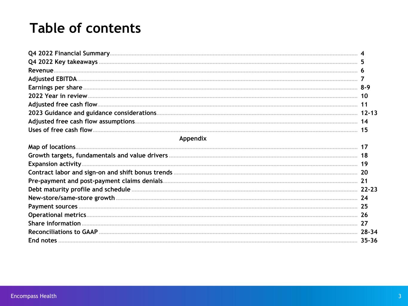 Encompass Health 3 Q4 2022 Financial Summary ............................................................................................................................................................... 4 Q4 2022 Key takeaways ...................................................................................................................................................................... 5 Revenue ................................................................................................................................................................................................... 6 Adjusted EBITDA .................................................................................................................................................................................... 7 Earnings per share ................................................................................................................................................................................ 8-9 2022 Year in review ............................................................................................................................................................................. 10 Adjusted free cash flow ....................................................................................................................................................................... 11 2023 Guidance and guidance considerations ................................................................................................................................. 12-13 Adjusted free cash flow assumptions ............................................................................................................................................... 14 Uses of free cash flow .......................................................................................................................................................................... 15 Appendix Map of locations ..................................................................................................................................................................................... 17 Growth targets, fundamentals and value drivers ......................................................................................................................... 18 Expansion activity ................................................................................................................................................................................. 19 Contract labor and sign-on and shift bonus trends ...................................................................................................................... 20 Pre-payment and post-payment claims denials ............................................................................................................................. 21 Debt maturity profile and schedule ................................................................................................................................................. 22-23 New-store/same-store growth ........................................................................................................................................................... 24 Payment sources ................................................................................................................................................................................... 25 Operational metrics .............................................................................................................................................................................. 26 Share information ................................................................................................................................................................................. 27 Reconciliations to GAAP ...................................................................................................................................................................... 28-34 End notes ................................................................................................................................................................................................ 35-36 Table of contents