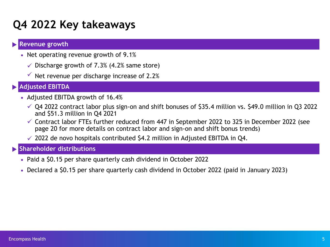 Encompass Health 4 Q4 2022 Financial summary Q4 Full Year ($ in millions) 2022 2021 % △ 2022 2021 % △ Encompass Health Net operating revenue $ 1,137.3 $ 1,042.5 9.1 % $ 4,348.6 $ 4,014.9 8.3 % Adjusted EBITDA $ 232.7 $ 199.9 16.4 % $ 819.3 $ 816.4 0.4 % Adjusted EPS $ 0.88 $ 0.67 31.3 % $ 2.85 $ 2.95 (3.4) % Adjusted free cash flow* $ 46.0 $ 28.2 63.1 % $ 340.1 $ 330.2 3.0 % *Refer to page 11 for a discussion of year-to-year change. Reconciliations to GAAP provided on pages 28-34. Encompass Health’s historical results reflect Enhabit Home Health and Hospice (“Enhabit”) as discontinued operations.