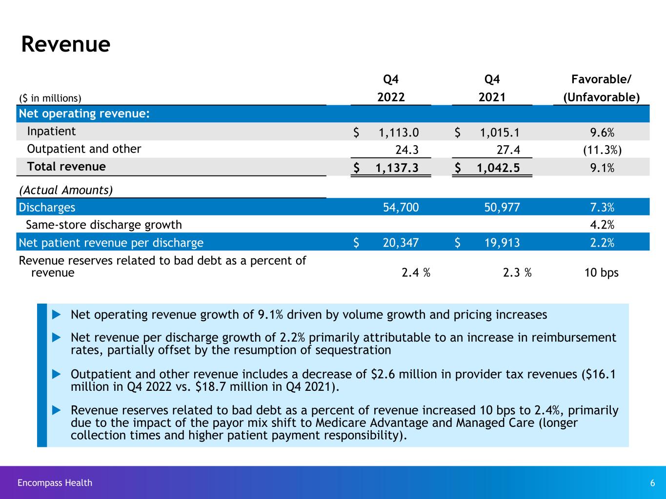Encompass Health 5 Q4 2022 Key takeaways u Revenue growth Ÿ Net operating revenue growth of 9.1% ü Discharge growth of 7.3% (4.2% same store) ü Net revenue per discharge increase of 2.2% u Adjusted EBITDA Ÿ Adjusted EBITDA growth of 16.4% ü Q4 2022 contract labor plus sign-on and shift bonuses of $35.4 million vs. $49.0 million in Q3 2022 and $51.3 million in Q4 2021 ü Contract labor FTEs further reduced from 447 in September 2022 to 325 in December 2022 (see page 20 for more details on contract labor and sign-on and shift bonus trends) ü 2022 de novo hospitals contributed $4.2 million in Adjusted EBITDA in Q4. u Shareholder distributions Ÿ Paid a $0.15 per share quarterly cash dividend in October 2022 Ÿ Declared a $0.15 per share quarterly cash dividend in October 2022 (paid in January 2023)