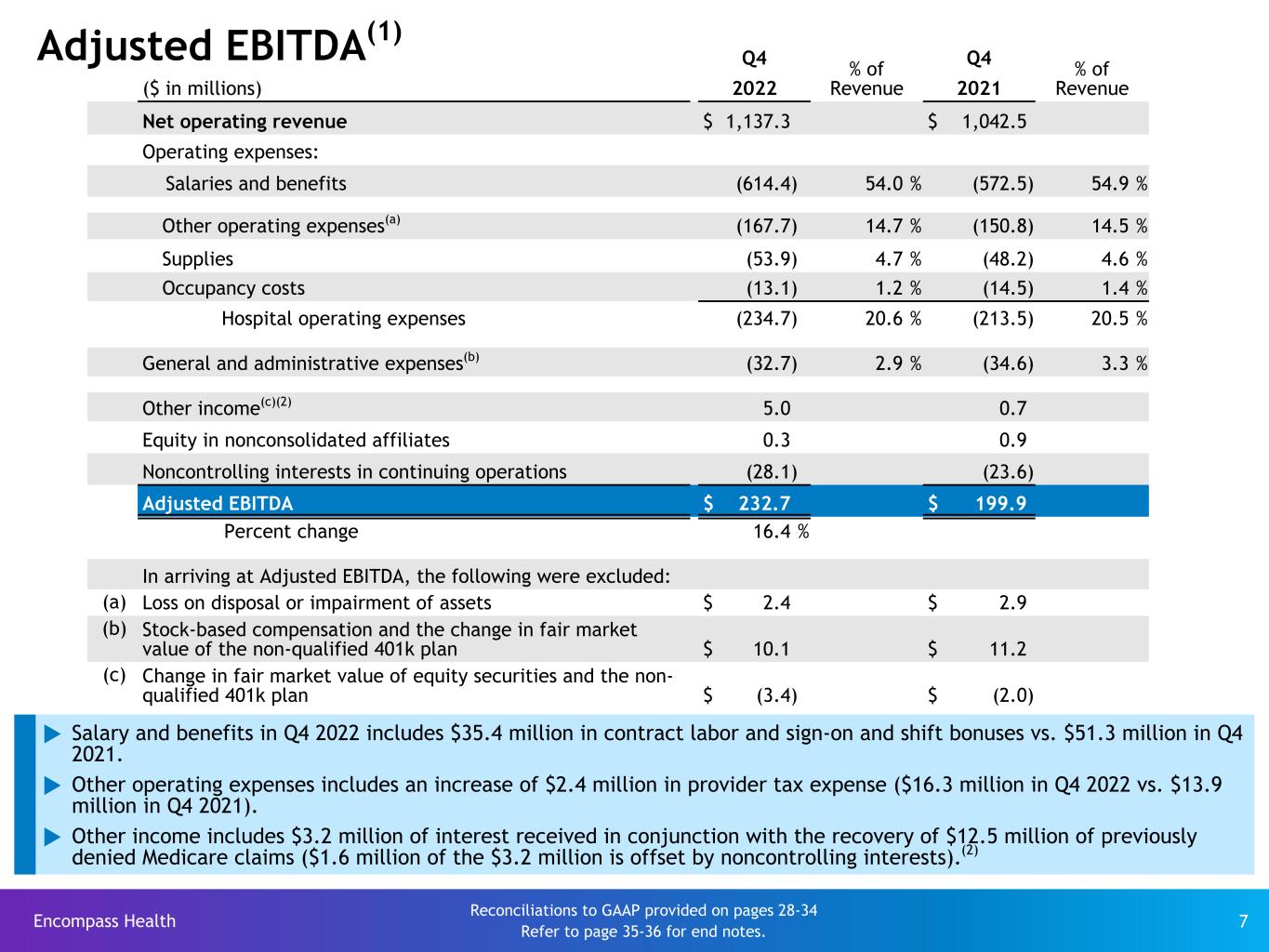 Encompass Health 6 Revenue Q4 Q4 Favorable/ ($ in millions) 2022 2021 (Unfavorable) Net operating revenue: Inpatient $ 1,113.0 $ 1,015.1 9.6% Outpatient and other 24.3 27.4 (11.3%) Total revenue $ 1,137.3 $ 1,042.5 9.1% (Actual Amounts) Discharges 54,700 50,977 7.3% Same-store discharge growth 4.2% Net patient revenue per discharge $ 20,347 $ 19,913 2.2% Revenue reserves related to bad debt as a percent of revenue 2.4 % 2.3 % 10 bps u Net operating revenue growth of 9.1% driven by volume growth and pricing increases u Net revenue per discharge growth of 2.2% primarily attributable to an increase in reimbursement rates, partially offset by the resumption of sequestration u Outpatient and other revenue includes a decrease of $2.6 million in provider tax revenues ($16.1 million in Q4 2022 vs. $18.7 million in Q4 2021). u Revenue reserves related to bad debt as a percent of revenue increased 10 bps to 2.4%, primarily due to the impact of the payor mix shift to Medicare Advantage and Managed Care (longer collection times and higher patient payment responsibility).