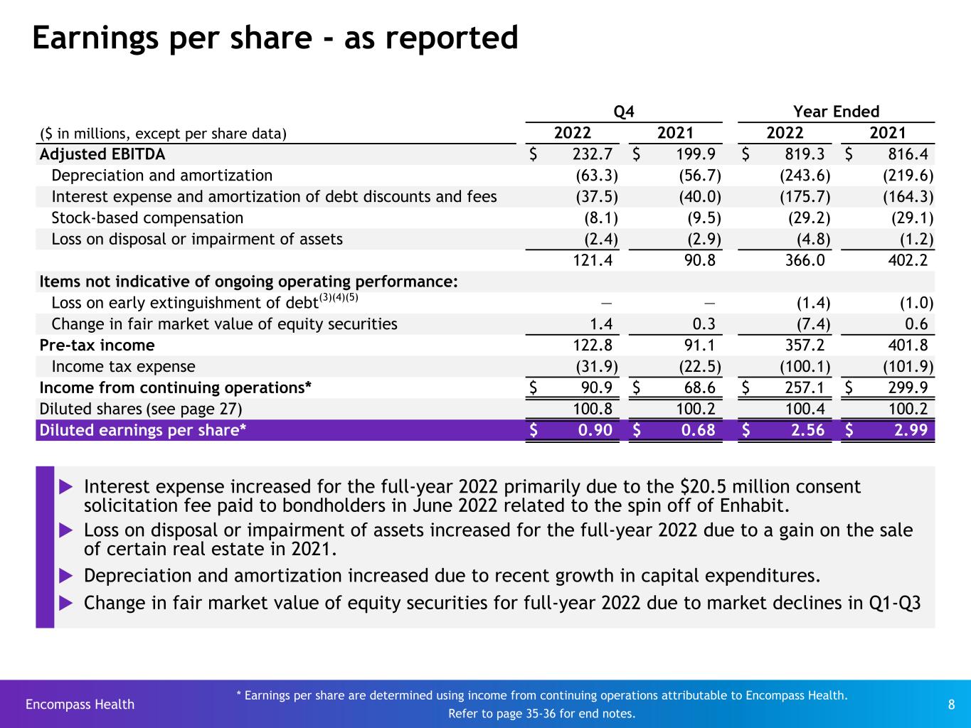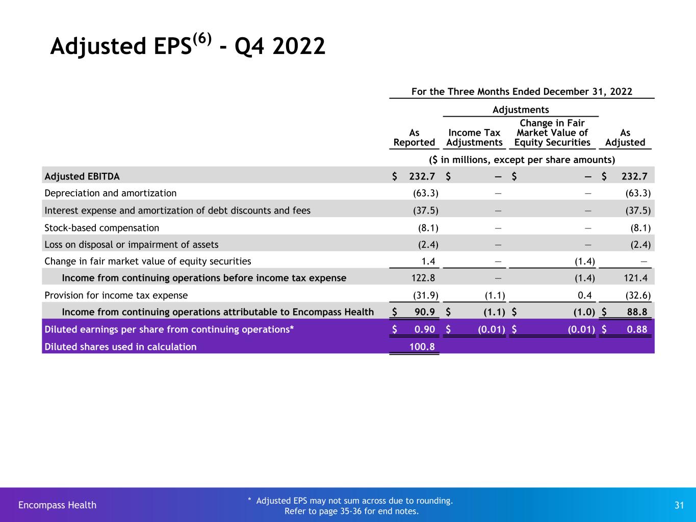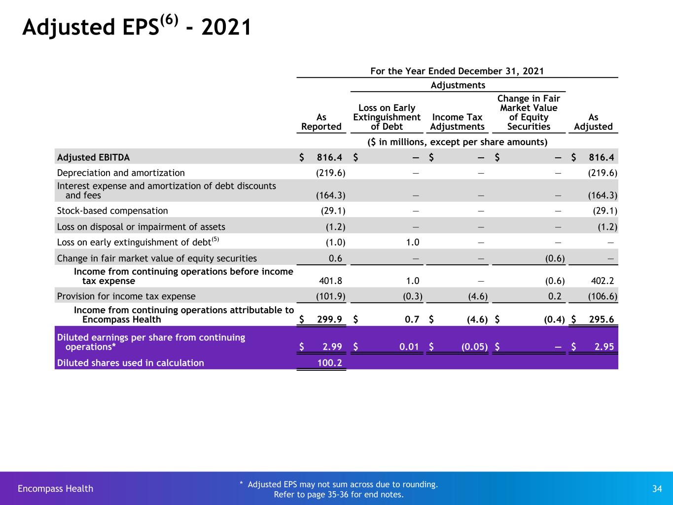 Encompass Health 33 Adjusted EPS(6) - 2022 For the Year Ended December 31, 2022 Adjustments As Reported Loss on Early Exting. of Debt Income Tax Adjustments Bondholder Consent Fees Associated with Enhabit Distribution Change in Fair Market Value of Equity Securities As Adjusted ($ in millions, except per share amounts) Adjusted EBITDA $ 819.3 $ — $ — $ — $ — $ 819.3 Depreciation and amortization (243.6) — — — — (243.6) Interest expense and amortization of debt discounts and fees (175.7) — — 20.5 — (155.2) Stock-based compensation (29.2) — — — — (29.2) Loss on disposal or impairment of assets (4.8) — — — — (4.8) Loss on early extinguishment of debt(3)(4) (1.4) 1.4 — — — — Change in fair market value of equity securities (7.4) — — — 7.4 — Income from continuing operations before income tax expense 357.2 1.4 — 20.5 7.4 386.5 Provision for income tax expense (100.1) (0.4) 7.4 (5.3) (1.9) (100.3) Income from continuing operations attributable to Encompass Health $ 257.1 $ 1.0 $ 7.4 $ 15.2 $ 5.5 $ 286.2 Diluted earnings per share from continuing operations* $ 2.56 $ 0.01 $ 0.07 $ 0.15 $ 0.05 $ 2.85 Diluted shares used in calculation 100.4 * Adjusted EPS may not sum across due to rounding. Refer to page 35-36 for end notes.