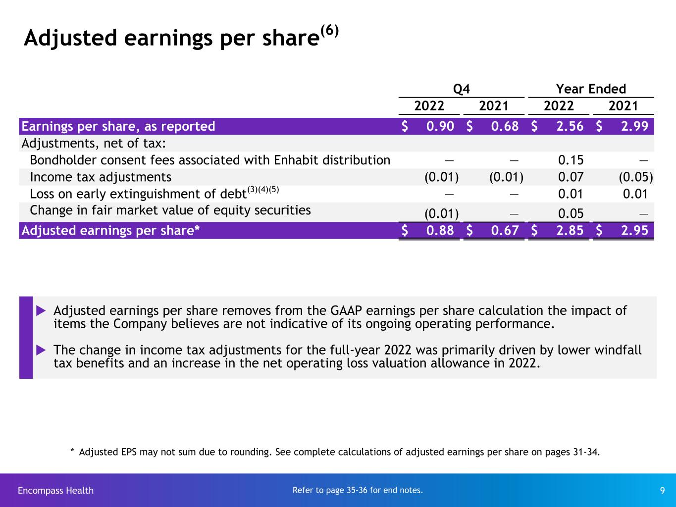Encompass Health 8 Earnings per share - as reported Q4 Year Ended ($ in millions, except per share data) 2022 2021 2022 2021 Adjusted EBITDA $ 232.7 $ 199.9 $ 819.3 $ 816.4 Depreciation and amortization (63.3) (56.7) (243.6) (219.6) Interest expense and amortization of debt discounts and fees (37.5) (40.0) (175.7) (164.3) Stock-based compensation (8.1) (9.5) (29.2) (29.1) Loss on disposal or impairment of assets (2.4) (2.9) (4.8) (1.2) 121.4 90.8 366.0 402.2 Items not indicative of ongoing operating performance: Loss on early extinguishment of debt(3)(4)(5) — — (1.4) (1.0) Change in fair market value of equity securities 1.4 0.3 (7.4) 0.6 Pre-tax income 122.8 91.1 357.2 401.8 Income tax expense (31.9) (22.5) (100.1) (101.9) Income from continuing operations* $ 90.9 $ 68.6 $ 257.1 $ 299.9 Diluted shares (see page 27) 100.8 100.2 100.4 100.2 Diluted earnings per share* $ 0.90 $ 0.68 $ 2.56 $ 2.99 * Earnings per share are determined using income from continuing operations attributable to Encompass Health. Refer to page 35-36 for end notes. u Interest expense increased for the full-year 2022 primarily due to the $20.5 million consent solicitation fee paid to bondholders in June 2022 related to the spin off of Enhabit. u Loss on disposal or impairment of assets increased for the full-year 2022 due to a gain on the sale of certain real estate in 2021. L o su Depreciation and amortization increased due to recent growth in capital expenditures. u Change in fair market value of equity securities for full-year 2022 due to market declines in Q1-Q3