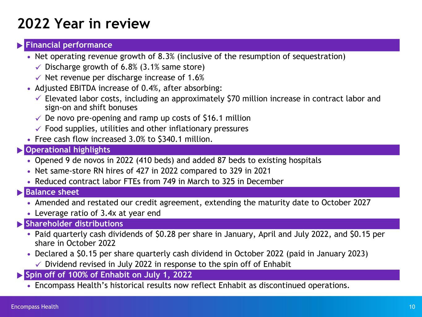 Encompass Health 9 Adjusted earnings per share(6) Refer to page 35-36 for end notes. Q4 Year Ended 2022 2021 2022 2021 Earnings per share, as reported $ 0.90 $ 0.68 $ 2.56 $ 2.99 Adjustments, net of tax: Bondholder consent fees associated with Enhabit distribution — — 0.15 — Income tax adjustments (0.01) (0.01) 0.07 (0.05) Loss on early extinguishment of debt(3)(4)(5) — — 0.01 0.01 Change in fair market value of equity securities (0.01) — 0.05 — Adjusted earnings per share* $ 0.88 $ 0.67 $ 2.85 $ 2.95 u Adjusted earnings per share removes from the GAAP earnings per share calculation the impact of items the Company believes are not indicative of its ongoing operating performance. u The change in income tax adjustments for the full-year 2022 was primarily driven by lower windfall tax benefits and an increase in the net operating loss valuation allowance in 2022. * Adjusted EPS may not sum due to rounding. See complete calculations of adjusted earnings per share on pages 31-34.