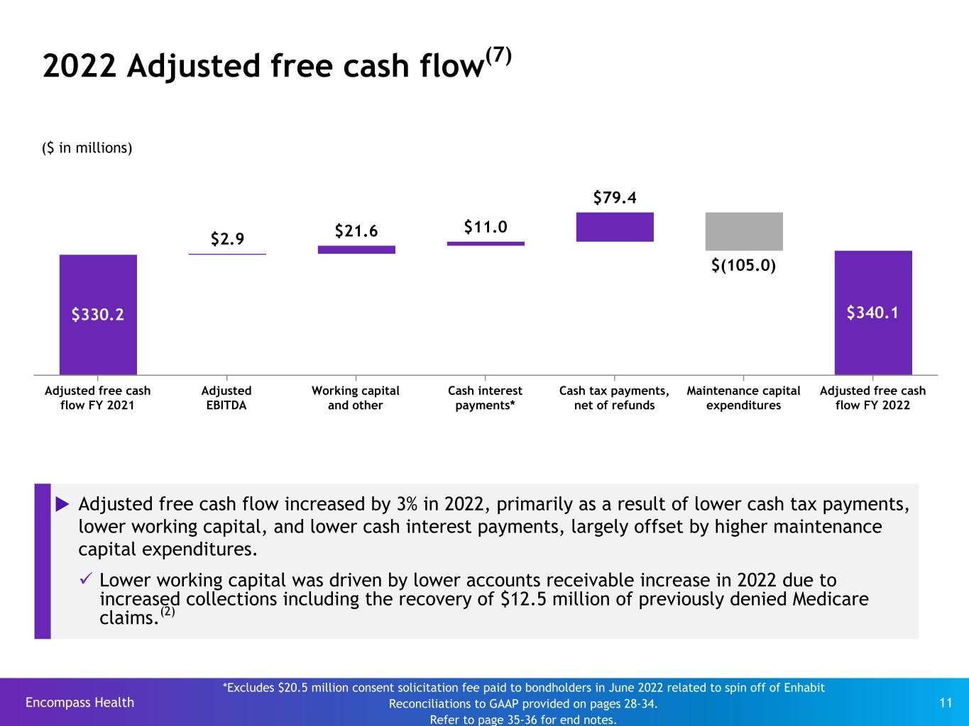 Encompass Health 10 2022 Year in review u Financial performance Ÿ Net operating revenue growth of 8.3% (inclusive of the resumption of sequestration) ü Discharge growth of 6.8% (3.1% same store) ü Net revenue per discharge increase of 1.6% Ÿ Adjusted EBITDA increase of 0.4%, after absorbing: ü Elevated labor costs, including an approximately $70 million increase in contract labor and sign-on and shift bonuses ü De novo pre-opening and ramp up costs of $16.1 million ü Food supplies, utilities and other inflationary pressures Ÿ Free cash flow increased 3.0% to $340.1 million. u Operational highlights Ÿ Opened 9 de novos in 2022 (410 beds) and added 87 beds to existing hospitals Ÿ Net same-store RN hires of 427 in 2022 compared to 329 in 2021 Ÿ Reduced contract labor FTEs from 749 in March to 325 in December u Balance sheet Ÿ Amended and restated our credit agreement, extending the maturity date to October 2027 Ÿ Leverage ratio of 3.4x at year end u Shareholder distributions Ÿ Paid quarterly cash dividends of $0.28 per share in January, April and July 2022, and $0.15 per share in October 2022 Ÿ Declared a $0.15 per share quarterly cash dividend in October 2022 (paid in January 2023) ü Dividend revised in July 2022 in response to the spin off of Enhabit u Spin off of 100% of Enhabit on July 1, 2022 Ÿ Encompass Health’s historical results now reflect Enhabit as discontinued operations.