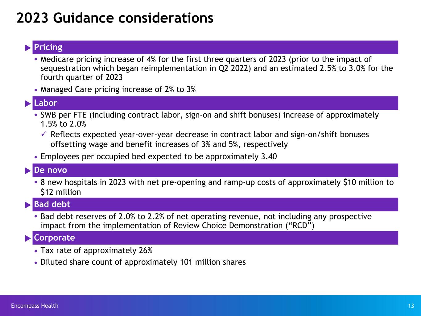 Encompass Health 13 2023 Guidance considerations u Pricing Ÿ Medicare pricing increase of 4% for the first three quarters of 2023 (prior to the impact of sequestration which began reimplementation in Q2 2022) and an estimated 2.5% to 3.0% for the fourth quarter of 2023 Ÿ Managed Care pricing increase of 2% to 3% u Labor Ÿ SWB per FTE (including contract labor, sign-on and shift bonuses) increase of approximately 1.5% to 2.0% ü Reflects expected year-over-year decrease in contract labor and sign-on/shift bonuses offsetting wage and benefit increases of 3% and 5%, respectively Ÿ Employees per occupied bed expected to be approximately 3.40 u De novo Ÿ 8 new hospitals in 2023 with net pre-opening and ramp-up costs of approximately $10 million to $12 million u Bad debt Ÿ Bad debt reserves of 2.0% to 2.2% of net operating revenue, not including any prospective impact from the implementation of Review Choice Demonstration (“RCD”) u Corporate Ÿ Tax rate of approximately 26% Ÿ Diluted share count of approximately 101 million shares
