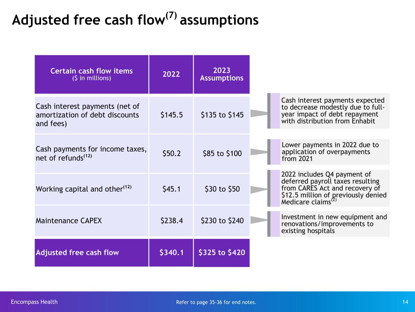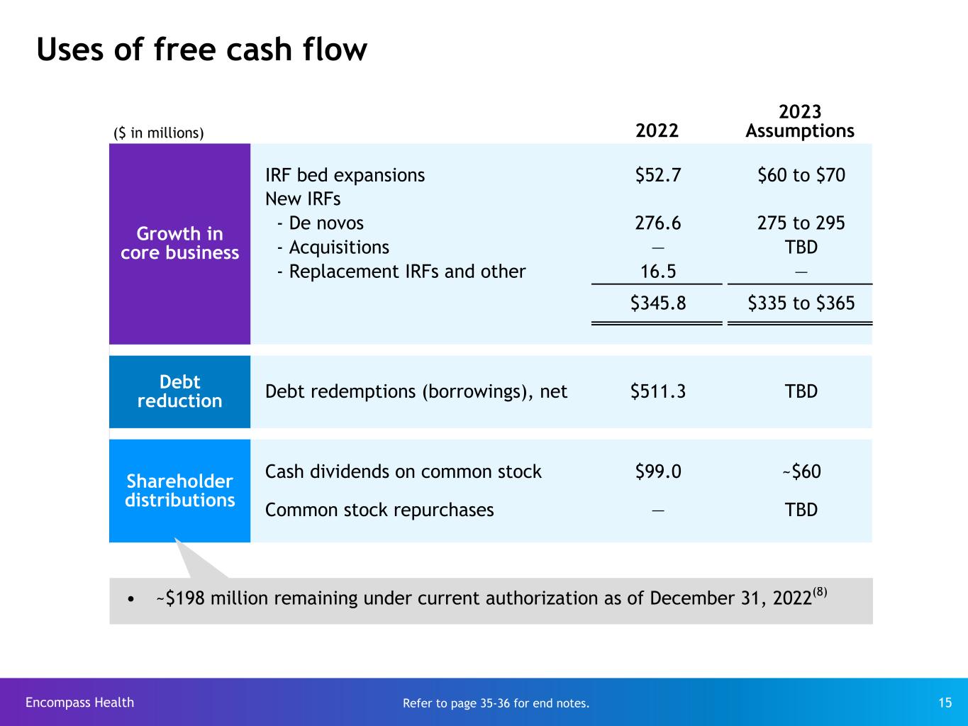 Encompass Health 14 Adjusted free cash flow(7) assumptions Certain cash flow items ($ in millions) 2022 2023 Assumptions Cash interest payments (net of amortization of debt discounts and fees) $145.5 $135 to $145 Cash payments for income taxes, net of refunds(12) $50.2 $85 to $100 Working capital and other(12) $45.1 $30 to $50 Maintenance CAPEX $238.4 $230 to $240 Adjusted free cash flow $340.1 $325 to $420 Lower payments in 2022 due to application of overpayments from 2021 2022 includes Q4 payment of deferred payroll taxes resulting from CARES Act and recovery of $12.5 million of previously denied Medicare claims(2) Investment in new equipment and renovations/improvements to existing hospitals Cash interest payments expected to decrease modestly due to full- year impact of debt repayment with distribution from Enhabit Refer to page 35-36 for end notes.