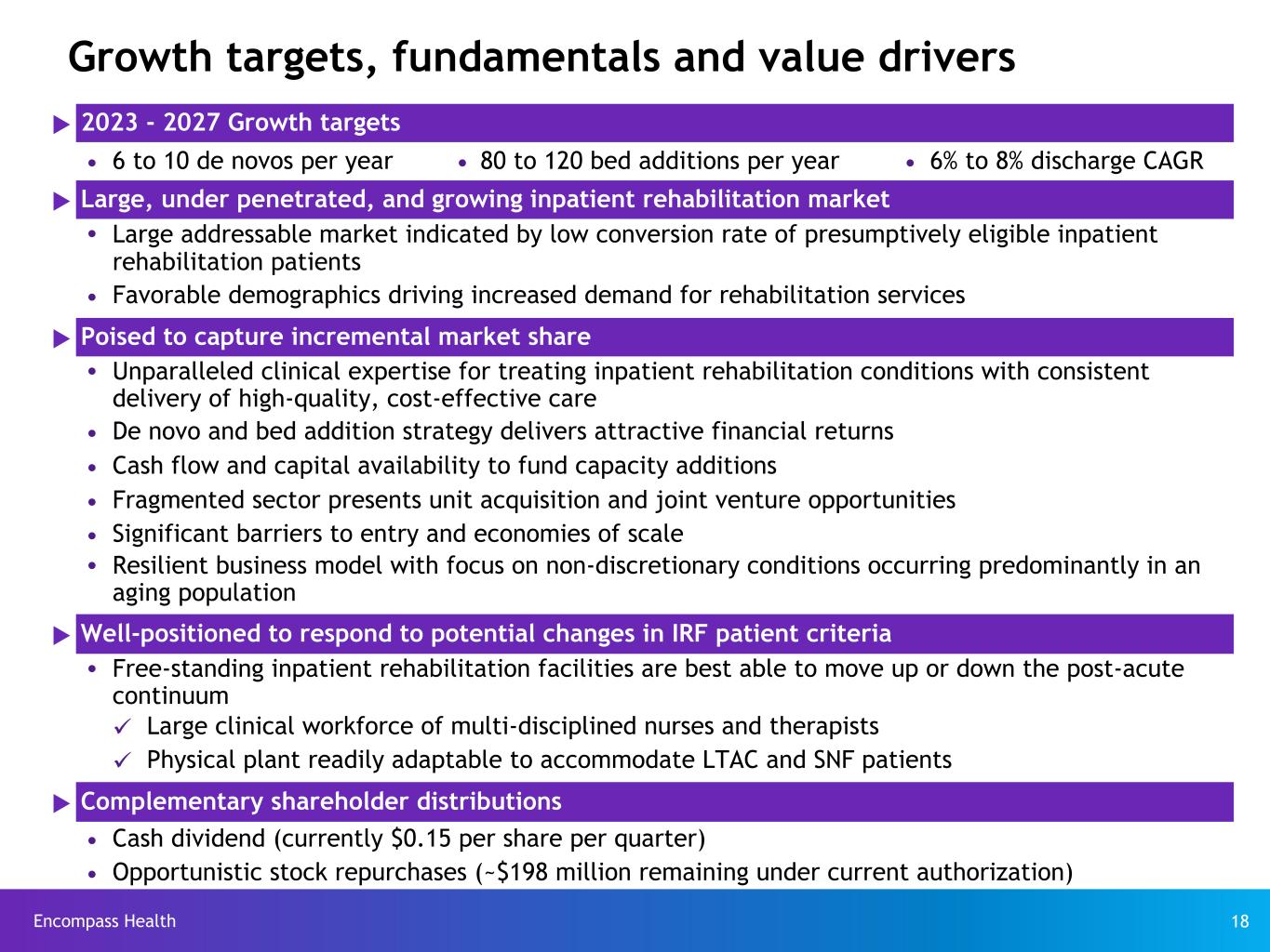 Encompass Health 17 ~35,000 employees Rehabilitation hospitals “IRFs” IRFs under development* * IRFs under development - previously announced under development as of February 7, 2023 † Based on 2022, 2021, and 2020 data Encompass Health Largest owner and operator of rehabilitation hospitals Company profile as of 12/31/22 153 Rehabilitation hospitals “IRFs” 58 are joint ventures 24 36 IRFs under development* States and Puerto Rico 24% of Licensed beds † 31% of Medicare patients served † Key statistics 2022 ~211,100 patient discharges ~$4.35 Billion in revenue FORTUNE® “World’s Most Admired Companies” 2022