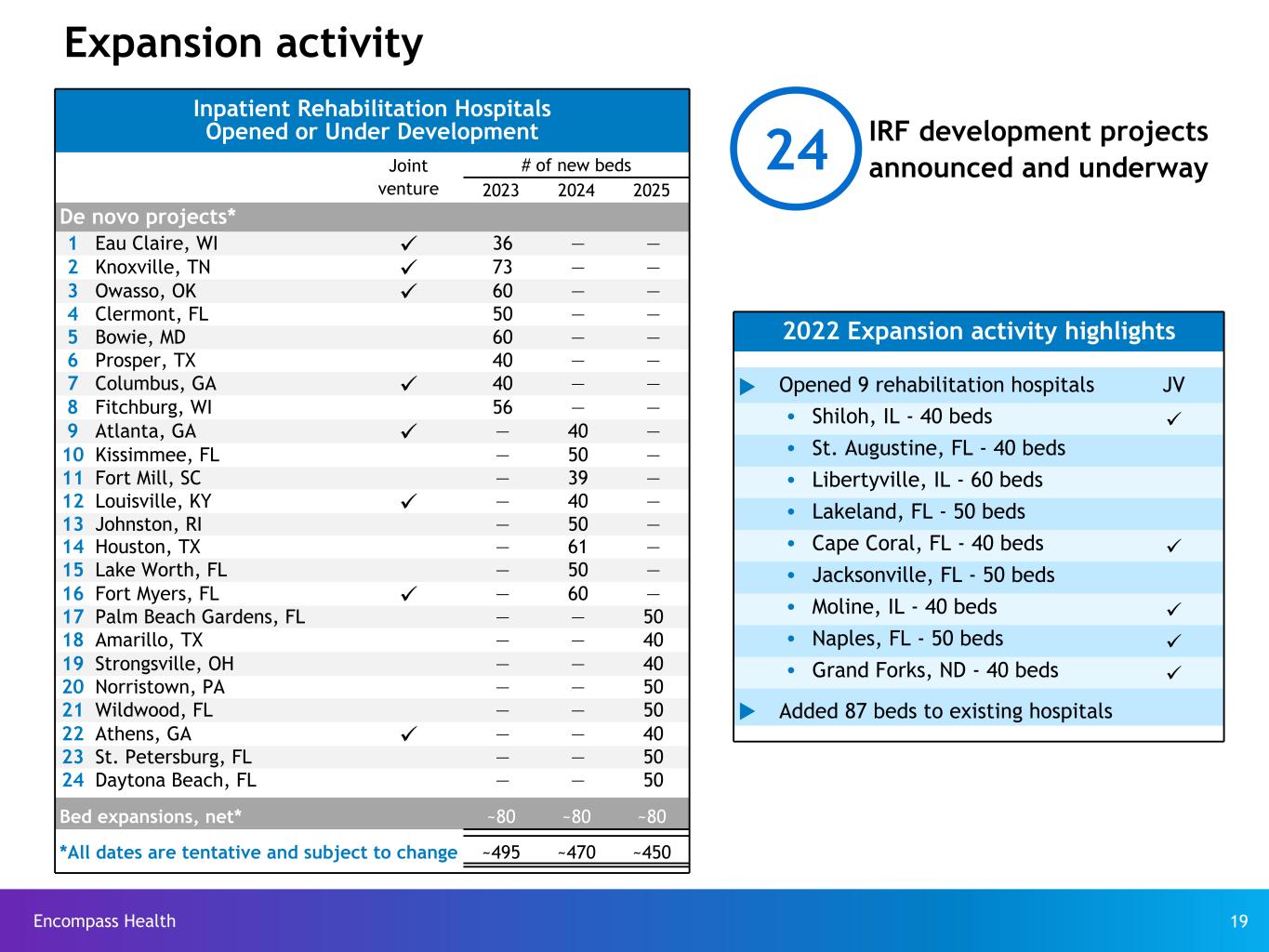 Encompass Health 19 Inpatient Rehabilitation Hospitals Opened or Under Development Joint venture # of new beds 2023 2024 2025 De novo projects* 1 Eau Claire, WI ü 36 — — 2 Knoxville, TN ü 73 — — 3 Owasso, OK ü 60 — — 4 Clermont, FL 50 — — 5 Bowie, MD 60 — — 6 Prosper, TX 40 — — 7 Columbus, GA ü 40 — — 8 Fitchburg, WI 56 — — 9 Atlanta, GA ü — 40 — 10 Kissimmee, FL — 50 — 11 Fort Mill, SC — 39 — 12 Louisville, KY ü — 40 — 13 Johnston, RI — 50 — 14 Houston, TX — 61 — 15 Lake Worth, FL — 50 — 16 Fort Myers, FL ü — 60 — 17 Palm Beach Gardens, FL — — 50 18 Amarillo, TX — — 40 19 Strongsville, OH — — 40 20 Norristown, PA — — 50 21 Wildwood, FL — — 50 22 Athens, GA ü — — 40 23 St. Petersburg, FL — — 50 24 Daytona Beach, FL — — 50 Bed expansions, net* ~80 ~80 ~80 *All dates are tentative and subject to change ~495 ~470 ~450 Expansion activity 2022 Expansion activity highlights u Opened 9 rehabilitation hospitals JV Ÿ Shiloh, IL - 40 beds ü Ÿ St. Augustine, FL - 40 beds Ÿ Libertyville, IL - 60 beds Ÿ Lakeland, FL - 50 beds Ÿ Cape Coral, FL - 40 beds ü Ÿ Jacksonville, FL - 50 beds Ÿ Moline, IL - 40 beds ü Ÿ Naples, FL - 50 beds ü Ÿ Grand Forks, ND - 40 beds ü u Added 87 beds to existing hospitals IRF development projects announced and underway 24