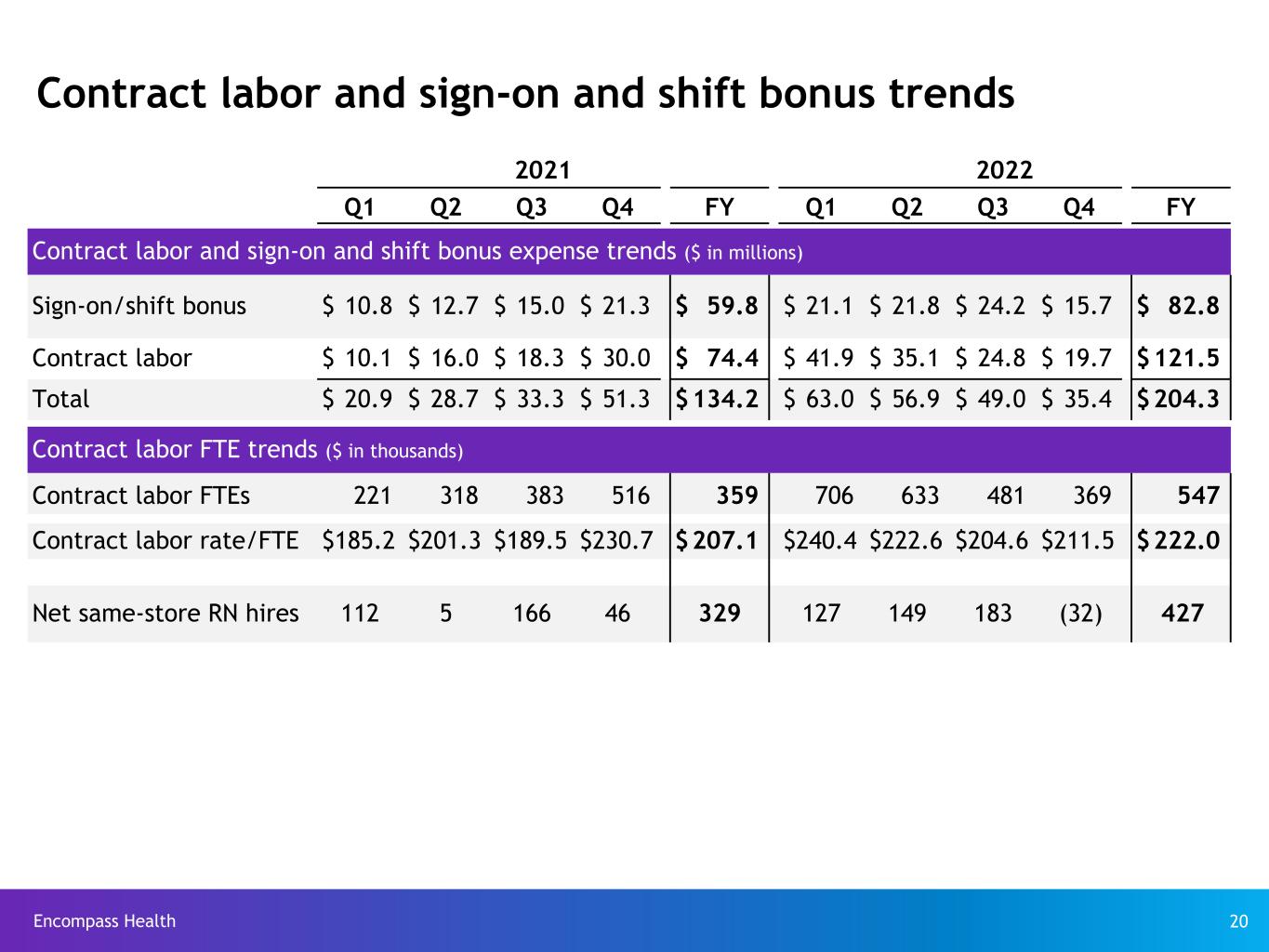 Encompass Health 20 Contract labor and sign-on and shift bonus trends 2021 2022 Q1 Q2 Q3 Q4 FY Q1 Q2 Q3 Q4 FY Contract labor and sign-on and shift bonus expense trends ($ in millions) Sign-on/shift bonus $ 10.8 $ 12.7 $ 15.0 $ 21.3 $ 59.8 $ 21.1 $ 21.8 $ 24.2 $ 15.7 $ 82.8 Contract labor $ 10.1 $ 16.0 $ 18.3 $ 30.0 $ 74.4 $ 41.9 $ 35.1 $ 24.8 $ 19.7 $ 121.5 Total $ 20.9 $ 28.7 $ 33.3 $ 51.3 $ 134.2 $ 63.0 $ 56.9 $ 49.0 $ 35.4 $ 204.3 Contract labor FTE trends ($ in thousands) Contract labor FTEs 221 318 383 516 359 706 633 481 369 547 Contract labor rate/FTE $ 185.2 $ 201.3 $ 189.5 $ 230.7 $ 207.1 $ 240.4 $ 222.6 $ 204.6 $ 211.5 $ 222.0 Net same-store RN hires 112 5 166 46 329 127 149 183 (32) 427