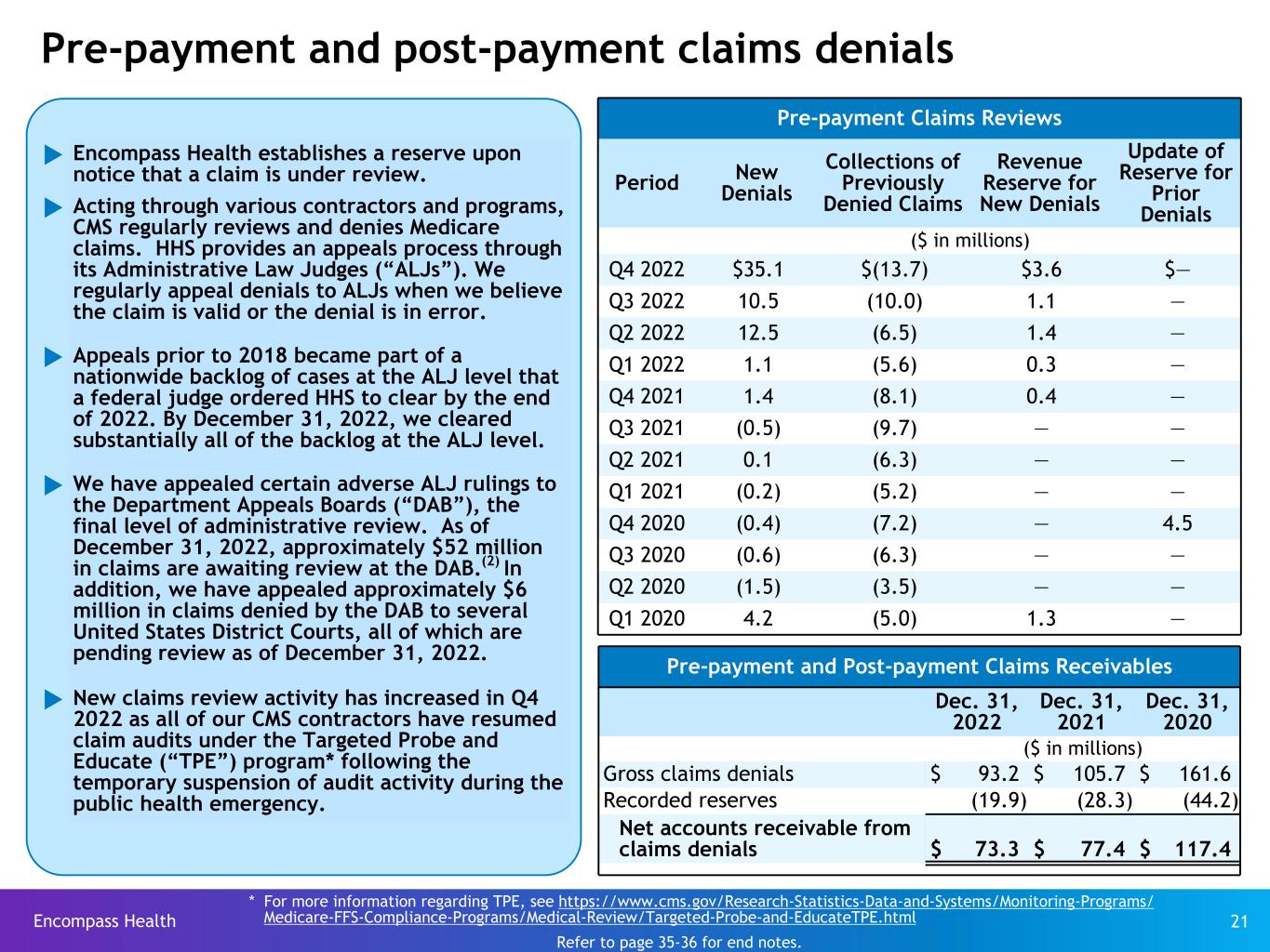 Encompass Health 21 Pre-payment and post-payment claims denials Pre-payment Claims Reviews Period New Denials Collections of Previously Denied Claims Revenue Reserve for New Denials Update of Reserve for Prior Denials ($ in millions) Q4 2022 $35.1 $(13.7) $3.6 $— Q3 2022 10.5 (10.0) 1.1 — Q2 2022 12.5 (6.5) 1.4 — Q1 2022 1.1 (5.6) 0.3 — Q4 2021 1.4 (8.1) 0.4 — Q3 2021 (0.5) (9.7) — — Q2 2021 0.1 (6.3) — — Q1 2021 (0.2) (5.2) — — Q4 2020 (0.4) (7.2) — 4.5 Q3 2020 (0.6) (6.3) — — Q2 2020 (1.5) (3.5) — — Q1 2020 4.2 (5.0) 1.3 — Pre-payment and Post-payment Claims Receivables Dec. 31, 2022 Dec. 31, 2021 Dec. 31, 2020 ($ in millions) Gross claims denials $ 93.2 $ 105.7 $ 161.6 Recorded reserves (19.9) (28.3) (44.2) Net accounts receivable from claims denials $ 73.3 $ 77.4 $ 117.4 * For more information regarding TPE, see https://www.cms.gov/Research-Statistics-Data-and-Systems/Monitoring-Programs/ Medicare-FFS-Compliance-Programs/Medical-Review/Targeted-Probe-and-EducateTPE.html u Encompass Health establishes a reserve upon notice that a claim is under review. u Acting through various contractors and programs, CMS regularly reviews and denies Medicare claims. HHS provides an appeals process through its Administrative Law Judges (“ALJs”). We regularly appeal denials to ALJs when we believe the claim is valid or the denial is in error. u Appeals prior to 2018 became part of a nationwide backlog of cases at the ALJ level that a federal judge ordered HHS to clear by the end of 2022. By December 31, 2022, we cleared substantially all of the backlog at the ALJ level. u We have appealed certain adverse ALJ rulings to the Department Appeals Boards (“DAB”), the final level of administrative review. As of December 31, 2022, approximately $52 million in claims are awaiting review at the DAB.(2) In addition, we have appealed approximately $6 million in claims denied by the DAB to several United States District Courts, all of which are pending review as of December 31, 2022. u New claims review activity has increased in Q4 2022 as all of our CMS contractors have resumed claim audits under the Targeted Probe and Educate (“TPE”) program* following the temporary suspension of audit activity during the public health emergency. Refer to page 35-36 for end notes.