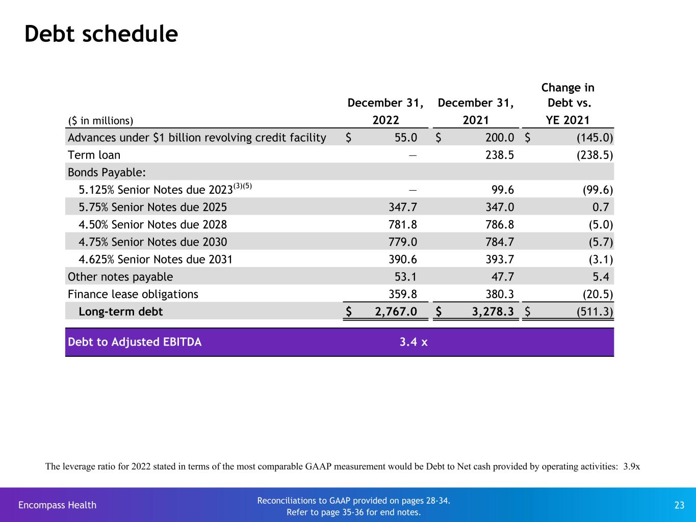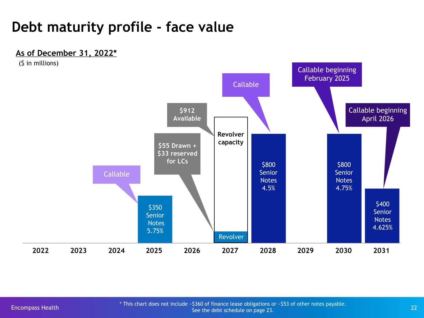 Encompass Health 22 2022 2023 2024 2025 2026 2027 2028 2029 2030 2031 * This chart does not include ~$360 of finance lease obligations or ~$53 of other notes payable. See the debt schedule on page 23. Debt maturity profile - face value $350 Senior Notes 5.75% ($ in millions) Revolver capacity $800 Senior Notes 4.75% $800 Senior Notes 4.5% Revolver As of December 31, 2022* $912 Available $55 Drawn + $33 reserved for LCs Callable Callable beginning February 2025 Callable $400 Senior Notes 4.625% Callable beginning April 2026