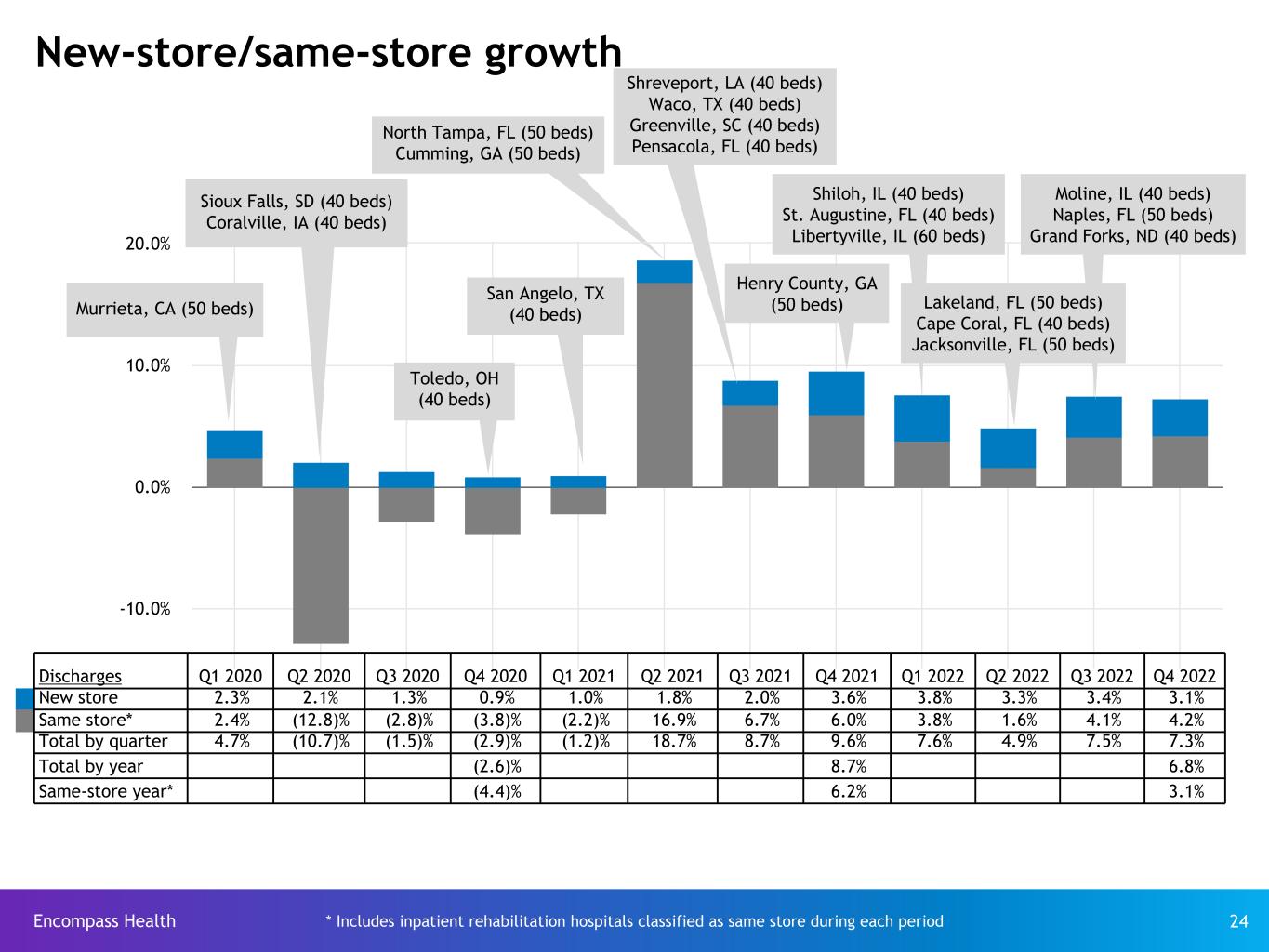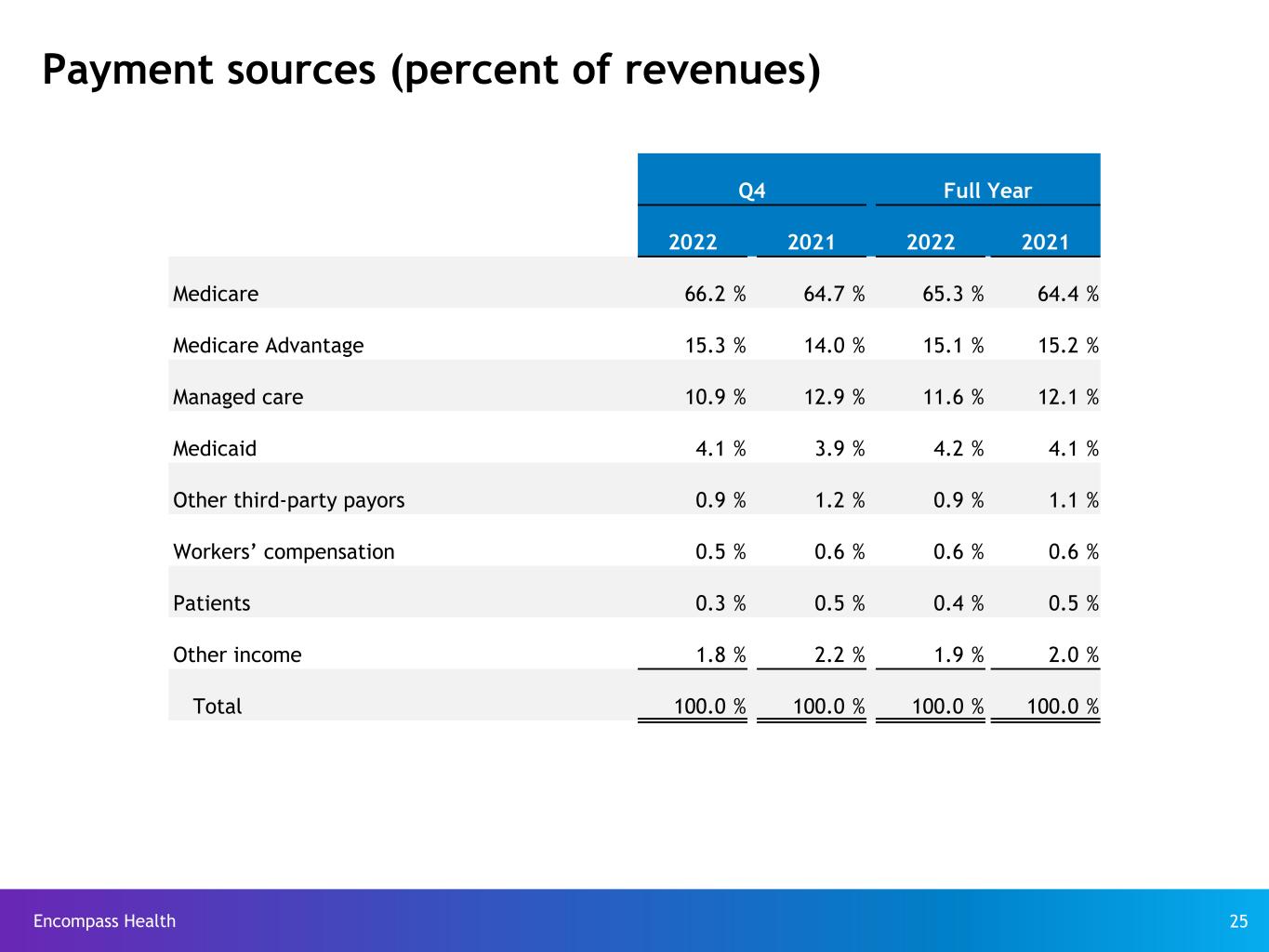Encompass Health 24 -10.0% 0.0% 10.0% 20.0% * Includes inpatient rehabilitation hospitals classified as same store during each period New-store/same-store growth North Tampa, FL (50 beds) Cumming, GA (50 beds) Shreveport, LA (40 beds) Waco, TX (40 beds) Greenville, SC (40 beds) Pensacola, FL (40 beds) Discharges Q1 2020 Q2 2020 Q3 2020 Q4 2020 Q1 2021 Q2 2021 Q3 2021 Q4 2021 Q1 2022 Q2 2022 Q3 2022 Q4 2022 New store 2.3% 2.1% 1.3% 0.9% 1.0% 1.8% 2.0% 3.6% 3.8% 3.3% 3.4% 3.1% Same store* 2.4% (12.8)% (2.8)% (3.8)% (2.2)% 16.9% 6.7% 6.0% 3.8% 1.6% 4.1% 4.2% Total by quarter 4.7% (10.7)% (1.5)% (2.9)% (1.2)% 18.7% 8.7% 9.6% 7.6% 4.9% 7.5% 7.3% Total by year (2.6)% 8.7% 6.8% Same-store year* (4.4)% 6.2% 3.1% Murrieta, CA (50 beds) Sioux Falls, SD (40 beds) Coralville, IA (40 beds) Toledo, OH (40 beds) San Angelo, TX (40 beds) Shiloh, IL (40 beds) St. Augustine, FL (40 beds) Libertyville, IL (60 beds) Henry County, GA (50 beds) Moline, IL (40 beds) Naples, FL (50 beds) Grand Forks, ND (40 beds) Lakeland, FL (50 beds) Cape Coral, FL (40 beds) Jacksonville, FL (50 beds)
