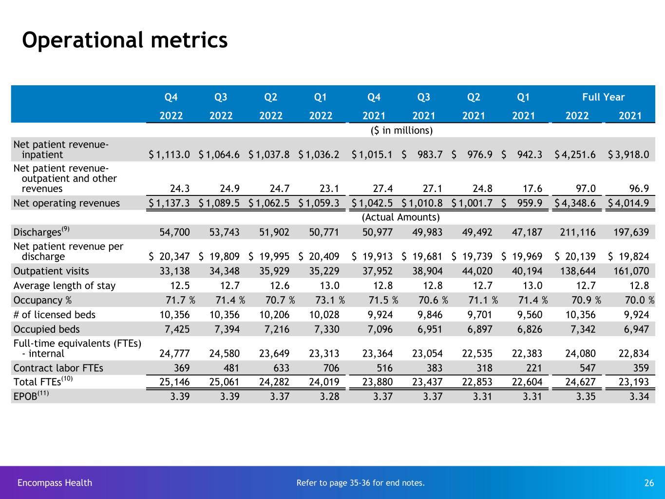 Encompass Health 26 Operational metrics Q4 Q3 Q2 Q1 Q4 Q3 Q2 Q1 Full Year 2022 2022 2022 2022 2021 2021 2021 2021 2022 2021 ($ in millions) Net patient revenue- inpatient $ 1,113.0 $ 1,064.6 $ 1,037.8 $ 1,036.2 $ 1,015.1 $ 983.7 $ 976.9 $ 942.3 $ 4,251.6 $ 3,918.0 Net patient revenue- outpatient and other revenues 24.3 24.9 24.7 23.1 27.4 27.1 24.8 17.6 97.0 96.9 Net operating revenues $ 1,137.3 $ 1,089.5 $ 1,062.5 $ 1,059.3 $ 1,042.5 $ 1,010.8 $ 1,001.7 $ 959.9 $ 4,348.6 $ 4,014.9 (Actual Amounts) Discharges(9) 54,700 53,743 51,902 50,771 50,977 49,983 49,492 47,187 211,116 197,639 Net patient revenue per discharge $ 20,347 $ 19,809 $ 19,995 $ 20,409 $ 19,913 $ 19,681 $ 19,739 $ 19,969 $ 20,139 $ 19,824 Outpatient visits 33,138 34,348 35,929 35,229 37,952 38,904 44,020 40,194 138,644 161,070 Average length of stay 12.5 12.7 12.6 13.0 12.8 12.8 12.7 13.0 12.7 12.8 Occupancy % 71.7 % 71.4 % 70.7 % 73.1 % 71.5 % 70.6 % 71.1 % 71.4 % 70.9 % 70.0 % # of licensed beds 10,356 10,356 10,206 10,028 9,924 9,846 9,701 9,560 10,356 9,924 Occupied beds 7,425 7,394 7,216 7,330 7,096 6,951 6,897 6,826 7,342 6,947 Full-time equivalents (FTEs) - internal 24,777 24,580 23,649 23,313 23,364 23,054 22,535 22,383 24,080 22,834 Contract labor FTEs 369 481 633 706 516 383 318 221 547 359 Total FTEs(10) 25,146 25,061 24,282 24,019 23,880 23,437 22,853 22,604 24,627 23,193 EPOB(11) 3.39 3.39 3.37 3.28 3.37 3.37 3.31 3.31 3.35 3.34 Refer to page 35-36 for end notes. To be updated