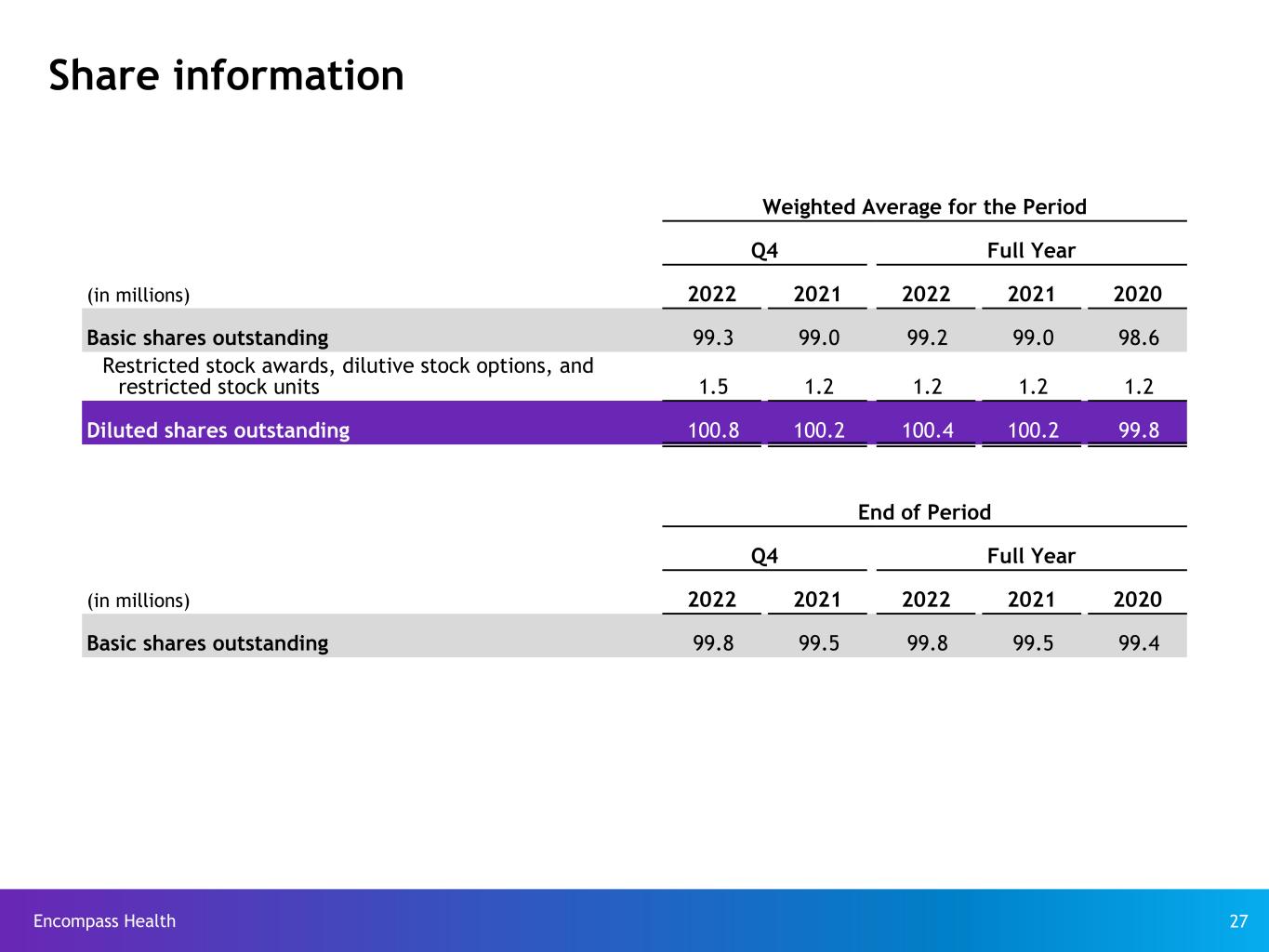 Encompass Health 27 Share information Weighted Average for the Period Q4 Full Year (in millions) 2022 2021 2022 2021 2020 Basic shares outstanding 99.3 99.0 99.2 99.0 98.6 Restricted stock awards, dilutive stock options, and restricted stock units 1.5 1.2 1.2 1.2 1.2 Diluted shares outstanding 100.8 100.2 100.4 100.2 99.8 End of Period Q4 Full Year (in millions) 2022 2021 2022 2021 2020 Basic shares outstanding 99.8 99.5 99.8 99.5 99.4 To be updated