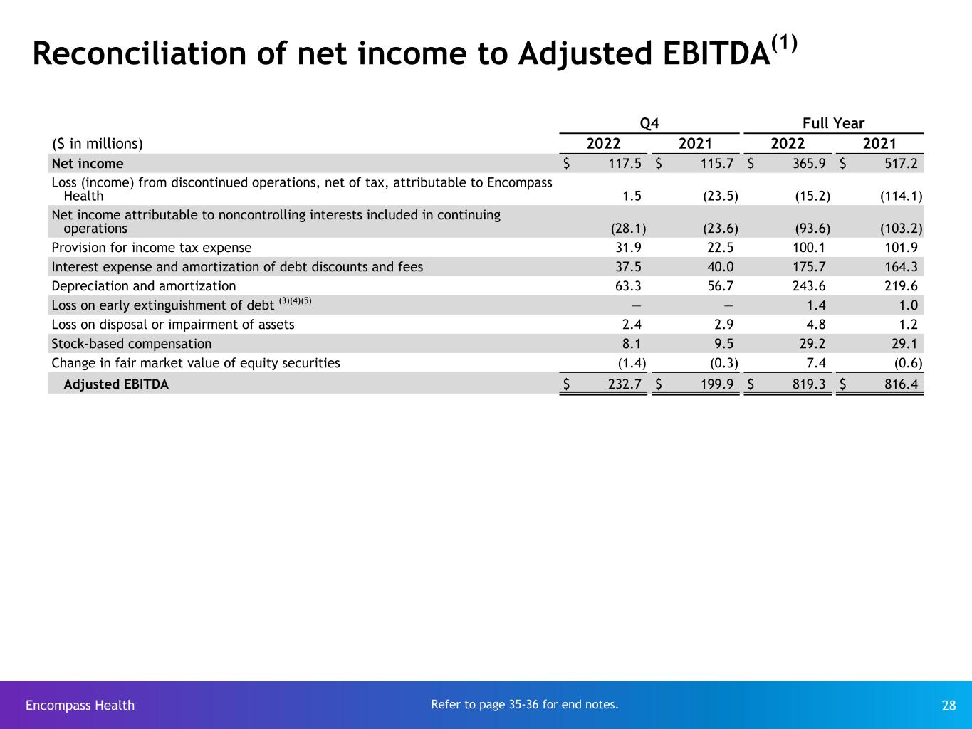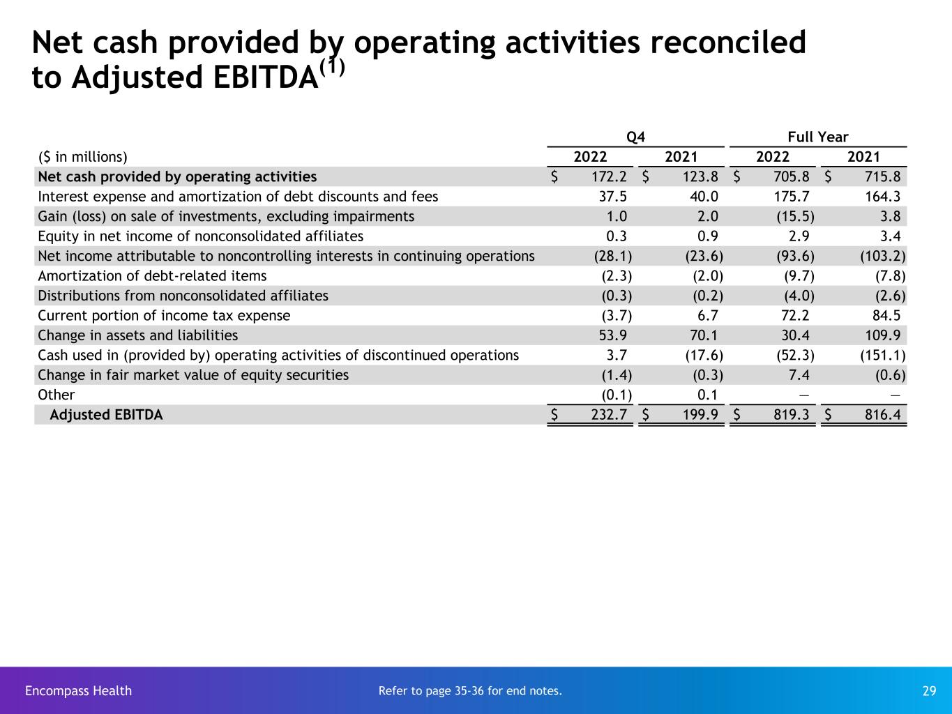 Encompass Health 28 Reconciliation of net income to Adjusted EBITDA(1) Q4 Full Year ($ in millions) 2022 2021 2022 2021 Net income $ 117.5 $ 115.7 $ 365.9 $ 517.2 Loss (income) from discontinued operations, net of tax, attributable to Encompass Health 1.5 (23.5) (15.2) (114.1) Net income attributable to noncontrolling interests included in continuing operations (28.1) (23.6) (93.6) (103.2) Provision for income tax expense 31.9 22.5 100.1 101.9 Interest expense and amortization of debt discounts and fees 37.5 40.0 175.7 164.3 Depreciation and amortization 63.3 56.7 243.6 219.6 Loss on early extinguishment of debt (3)(4)(5) — — 1.4 1.0 Loss on disposal or impairment of assets 2.4 2.9 4.8 1.2 Stock-based compensation 8.1 9.5 29.2 29.1 Change in fair market value of equity securities (1.4) (0.3) 7.4 (0.6) Adjusted EBITDA $ 232.7 $ 199.9 $ 819.3 $ 816.4 Refer to page 35-36 for end notes.