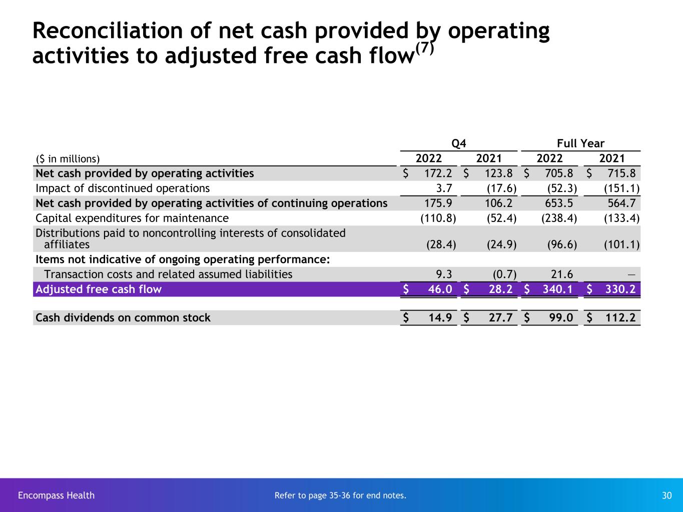 Encompass Health 29 Net cash provided by operating activities reconciled to Adjusted EBITDA(1) Q4 Full Year ($ in millions) 2022 2021 2022 2021 Net cash provided by operating activities $ 172.2 $ 123.8 $ 705.8 $ 715.8 Interest expense and amortization of debt discounts and fees 37.5 40.0 175.7 164.3 Gain (loss) on sale of investments, excluding impairments 1.0 2.0 (15.5) 3.8 Equity in net income of nonconsolidated affiliates 0.3 0.9 2.9 3.4 Net income attributable to noncontrolling interests in continuing operations (28.1) (23.6) (93.6) (103.2) Amortization of debt-related items (2.3) (2.0) (9.7) (7.8) Distributions from nonconsolidated affiliates (0.3) (0.2) (4.0) (2.6) Current portion of income tax expense (3.7) 6.7 72.2 84.5 Change in assets and liabilities 53.9 70.1 30.4 109.9 Cash used in (provided by) operating activities of discontinued operations 3.7 (17.6) (52.3) (151.1) Change in fair market value of equity securities (1.4) (0.3) 7.4 (0.6) Other (0.1) 0.1 — — Adjusted EBITDA $ 232.7 $ 199.9 $ 819.3 $ 816.4 Refer to page 35-36 for end notes.