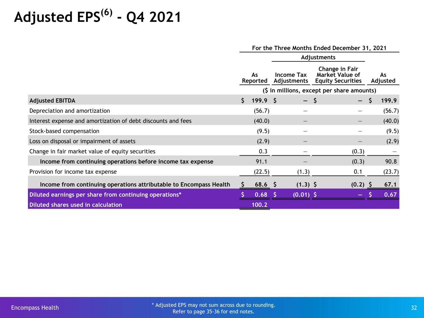 Encompass Health 31 Adjusted EPS(6) - Q4 2022 For the Three Months Ended December 31, 2022 Adjustments As Reported Income Tax Adjustments Change in Fair Market Value of Equity Securities As Adjusted ($ in millions, except per share amounts) Adjusted EBITDA $ 232.7 $ — $ — $ 232.7 Depreciation and amortization (63.3) — — (63.3) Interest expense and amortization of debt discounts and fees (37.5) — — (37.5) Stock-based compensation (8.1) — — (8.1) Loss on disposal or impairment of assets (2.4) — — (2.4) Change in fair market value of equity securities 1.4 — (1.4) — Income from continuing operations before income tax expense 122.8 — (1.4) 121.4 Provision for income tax expense (31.9) (1.1) 0.4 (32.6) Income from continuing operations attributable to Encompass Health $ 90.9 $ (1.1) $ (1.0) $ 88.8 Diluted earnings per share from continuing operations* $ 0.90 $ (0.01) $ (0.01) $ 0.88 Diluted shares used in calculation 100.8 * Adjusted EPS may not sum across due to rounding. Refer to page 35-36 for end notes.