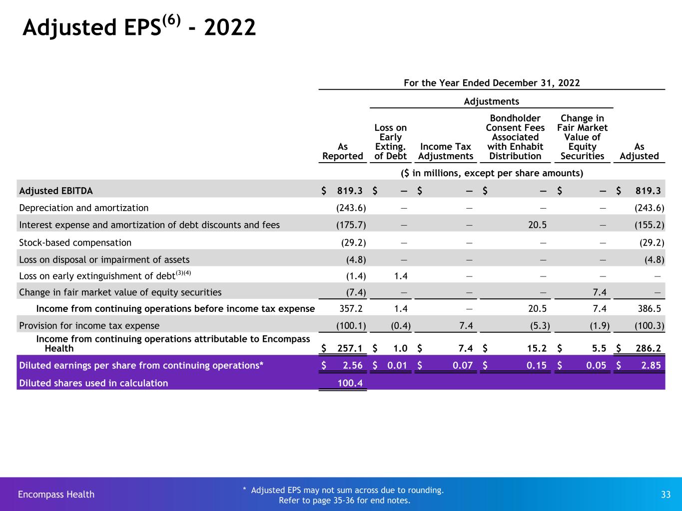 Encompass Health 32 For the Three Months Ended December 31, 2021 Adjustments As Reported Income Tax Adjustments Change in Fair Market Value of Equity Securities As Adjusted ($ in millions, except per share amounts) Adjusted EBITDA $ 199.9 $ — $ — $ 199.9 Depreciation and amortization (56.7) — — (56.7) Interest expense and amortization of debt discounts and fees (40.0) — — (40.0) Stock-based compensation (9.5) — — (9.5) Loss on disposal or impairment of assets (2.9) — — (2.9) Change in fair market value of equity securities 0.3 — (0.3) — Income from continuing operations before income tax expense 91.1 — (0.3) 90.8 Provision for income tax expense (22.5) (1.3) 0.1 (23.7) Income from continuing operations attributable to Encompass Health $ 68.6 $ (1.3) $ (0.2) $ 67.1 Diluted earnings per share from continuing operations* $ 0.68 $ (0.01) $ — $ 0.67 Diluted shares used in calculation 100.2 Adjusted EPS(6) - Q4 2021 * Adjusted EPS may not sum across due to rounding. Refer to page 35-36 for end notes.