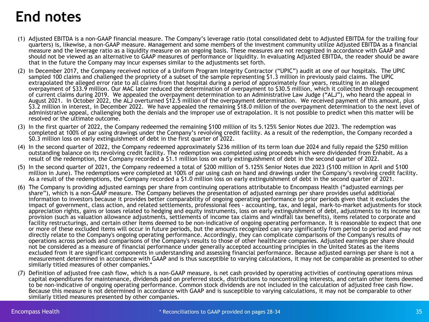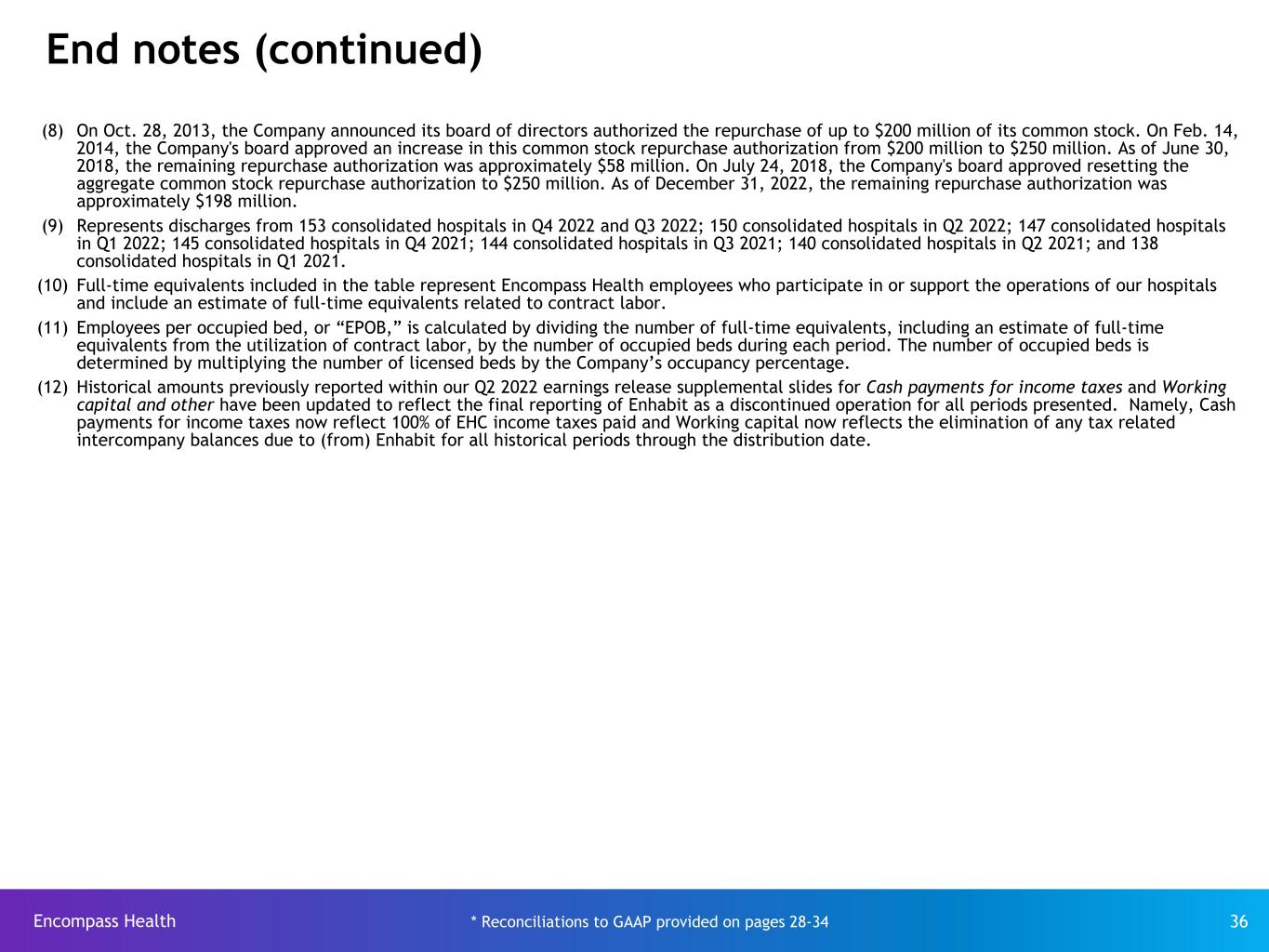 Encompass Health 35 End notes * Reconciliations to GAAP provided on pages 28-34 (1) Adjusted EBITDA is a non-GAAP financial measure. The Company’s leverage ratio (total consolidated debt to Adjusted EBITDA for the trailing four quarters) is, likewise, a non-GAAP measure. Management and some members of the investment community utilize Adjusted EBITDA as a financial measure and the leverage ratio as a liquidity measure on an ongoing basis. These measures are not recognized in accordance with GAAP and should not be viewed as an alternative to GAAP measures of performance or liquidity. In evaluating Adjusted EBITDA, the reader should be aware that in the future the Company may incur expenses similar to the adjustments set forth. (2) In December 2017, the Company received notice of a Uniform Program Integrity Contractor (“UPIC”) audit at one of our hospitals. The UPIC sampled 100 claims and challenged the propriety of a subset of the sample representing $1.3 million in previously paid claims. The UPIC extrapolated the alleged error rate to all claims from that hospital during a period of approximately four years, resulting in an alleged overpayment of $33.9 million. Our MAC later reduced the determination of overpayment to $30.5 million, which it collected through recoupment of current claims during 2019. We appealed the overpayment determination to an Administrative Law Judge (“ALJ”), who heard the appeal in August 2021. In October 2022, the ALJ overturned $12.5 million of the overpayment determination. We received payment of this amount, plus $3.2 million in interest, in December 2022. We have appealed the remaining $18.0 million of the overpayment determination to the next level of administrative appeal, challenging both the denials and the improper use of extrapolation. It is not possible to predict when this matter will be resolved or the ultimate outcome. (3) In the first quarter of 2022, the Company redeemed the remaining $100 million of its 5.125% Senior Notes due 2023. The redemption was completed at 100% of par using drawings under the Company’s revolving credit facility. As a result of the redemption, the Company recorded a $0.3 million loss on early extinguishment of debt in the first quarter of 2022. (4) In the second quarter of 2022, the Company redeemed approximately $236 million of its term loan due 2024 and fully repaid the $250 million outstanding balance on its revolving credit facility. The redemption was completed using proceeds which were dividended from Enhabit. As a result of the redemption, the Company recorded a $1.1 million loss on early extinguishment of debt in the second quarter of 2022. (5) In the second quarter of 2021, the Company redeemed a total of $200 million of 5.125% Senior Notes due 2023 ($100 million in April and $100 million in June). The redemptions were completed at 100% of par using cash on hand and drawings under the Company’s revolving credit facility. As a result of the redemptions, the Company recorded a $1.0 million loss on early extinguishment of debt in the second quarter of 2021. (6) The Company is providing adjusted earnings per share from continuing operations attributable to Encompass Health (“adjusted earnings per share”), which is a non-GAAP measure. The Company believes the presentation of adjusted earnings per share provides useful additional information to investors because it provides better comparability of ongoing operating performance to prior periods given that it excludes the impact of government, class action, and related settlements, professional fees - accounting, tax, and legal, mark-to-market adjustments for stock appreciation rights, gains or losses related to hedging and equity instruments, loss on early extinguishment of debt, adjustments to its income tax provision (such as valuation allowance adjustments, settlements of income tax claims and windfall tax benefits), items related to corporate and facility restructurings, and certain other items deemed to be non-indicative of ongoing operating performance. It is reasonable to expect that one or more of these excluded items will occur in future periods, but the amounts recognized can vary significantly from period to period and may not directly relate to the Company's ongoing operating performance. Accordingly, they can complicate comparisons of the Company's results of operations across periods and comparisons of the Company's results to those of other healthcare companies. Adjusted earnings per share should not be considered as a measure of financial performance under generally accepted accounting principles in the United States as the items excluded from it are significant components in understanding and assessing financial performance. Because adjusted earnings per share is not a measurement determined in accordance with GAAP and is thus susceptible to varying calculations, it may not be comparable as presented to other similarly titled measures of other companies.* (7) Definition of adjusted free cash flow, which is a non-GAAP measure, is net cash provided by operating activities of continuing operations minus capital expenditures for maintenance, dividends paid on preferred stock, distributions to noncontrolling interests, and certain other items deemed to be non-indicative of ongoing operating performance. Common stock dividends are not included in the calculation of adjusted free cash flow. Because this measure is not determined in accordance with GAAP and is susceptible to varying calculations, it may not be comparable to other similarly titled measures presented by other companies.