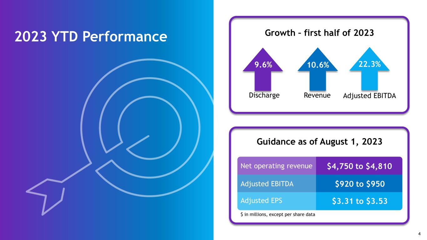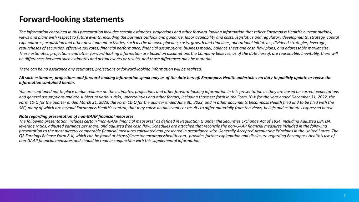 2 The information contained in this presentation includes certain estimates, projections and other forward-looking information that reflect Encompass Health’s current outlook, views and plans with respect to future events, including the business outlook and guidance, labor availability and costs, legislative and regulatory developments, strategy, capital expenditures, acquisition and other development activities, such as the de novo pipeline, costs, growth and timelines, operational initiatives, dividend strategies, leverage, repurchases of securities, effective tax rates, financial performance, financial assumptions, business model, balance sheet and cash flow plans, and addressable market size. These estimates, projections and other forward-looking information are based on assumptions the Company believes, as of the date hereof, are reasonable. Inevitably, there will be differences between such estimates and actual events or results, and those differences may be material. There can be no assurance any estimates, projections or forward-looking information will be realized. All such estimates, projections and forward-looking information speak only as of the date hereof. Encompass Health undertakes no duty to publicly update or revise the information contained herein. You are cautioned not to place undue reliance on the estimates, projections and other forward-looking information in this presentation as they are based on current expectations and general assumptions and are subject to various risks, uncertainties and other factors, including those set forth in the Form 10-K for the year ended December 31, 2022, the Form 10-Q for the quarter ended March 31, 2023, the Form 10-Q for the quarter ended June 30, 2023, and in other documents Encompass Health filed and to be filed with the SEC, many of which are beyond Encompass Health’s control, that may cause actual events or results to differ materially from the views, beliefs and estimates expressed herein. Note regarding presentation of non-GAAP financial measures The following presentation includes certain “non-GAAP financial measures” as defined in Regulation G under the Securities Exchange Act of 1934, including Adjusted EBITDA, leverage ratios, adjusted earnings per share, and adjusted free cash flow. Schedules are attached that reconcile the non-GAAP financial measures included in the following presentation to the most directly comparable financial measures calculated and presented in accordance with Generally Accepted Accounting Principles in the United States. The Q2 Earnings Release Form 8-K, which can be found at https://investor.encompasshealth.com, provides further explanation and disclosure regarding Encompass Health’s use of non-GAAP financial measures and should be read in conjunction with this supplemental information. Forward-looking statements