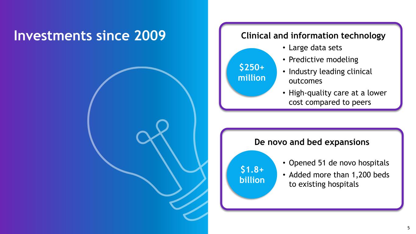 Investments since 2009 Clinical and information technology $250+ million • Large data sets • Predictive modeling • Industry leading clinical outcomes • High-quality care at a lower cost compared to peers De novo and bed expansions $1.8+ billion • Opened 51 de novo hospitals • Added more than 1,200 beds to existing hospitals 5