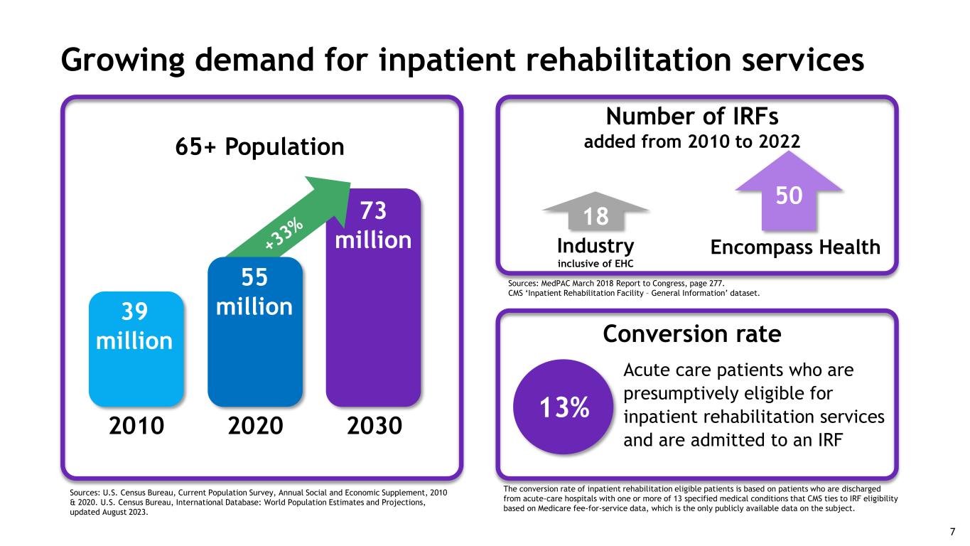 Growing demand for inpatient rehabilitation services 2010 2020 2030 65+ Population 39 million 73 million Number of IRFs added from 2010 to 2022 Conversion rate Industry inclusive of EHC 18 13% Acute care patients who are presumptively eligible for inpatient rehabilitation services and are admitted to an IRF Sources: U.S. Census Bureau, Current Population Survey, Annual Social and Economic Supplement, 2010 & 2020. U.S. Census Bureau, International Database: World Population Estimates and Projections, updated August 2023. Encompass Health 50 Sources: MedPAC March 2018 Report to Congress, page 277. CMS ‘Inpatient Rehabilitation Facility – General Information’ dataset. The conversion rate of inpatient rehabilitation eligible patients is based on patients who are discharged from acute-care hospitals with one or more of 13 specified medical conditions that CMS ties to IRF eligibility based on Medicare fee-for-service data, which is the only publicly available data on the subject. 55 million 7