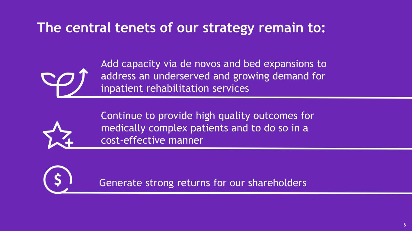 The central tenets of our strategy remain to: Add capacity via de novos and bed expansions to address an underserved and growing demand for inpatient rehabilitation services Continue to provide high quality outcomes for medically complex patients and to do so in a cost-effective manner Generate strong returns for our shareholders 8