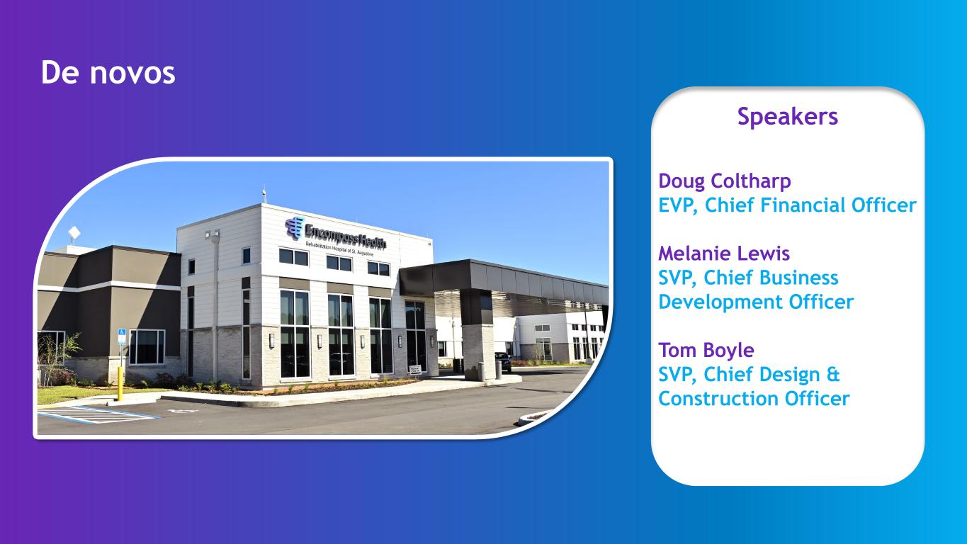 Speakers De novos Doug Coltharp EVP, Chief Financial Officer Melanie Lewis SVP, Chief Business Development Officer Tom Boyle SVP, Chief Design & Construction Officer