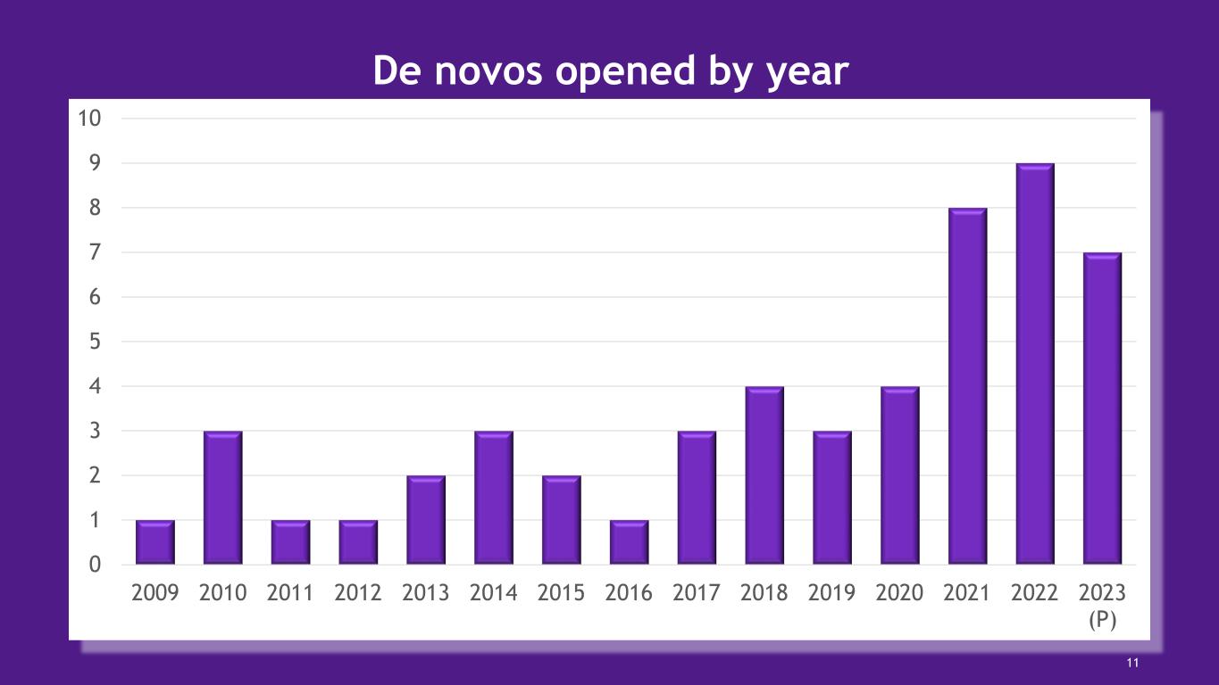 0 1 2 3 4 5 6 7 8 9 10 2009 2010 2011 2012 2013 2014 2015 2016 2017 2018 2019 2020 2021 2022 2023 (P) De novos opened by year 11